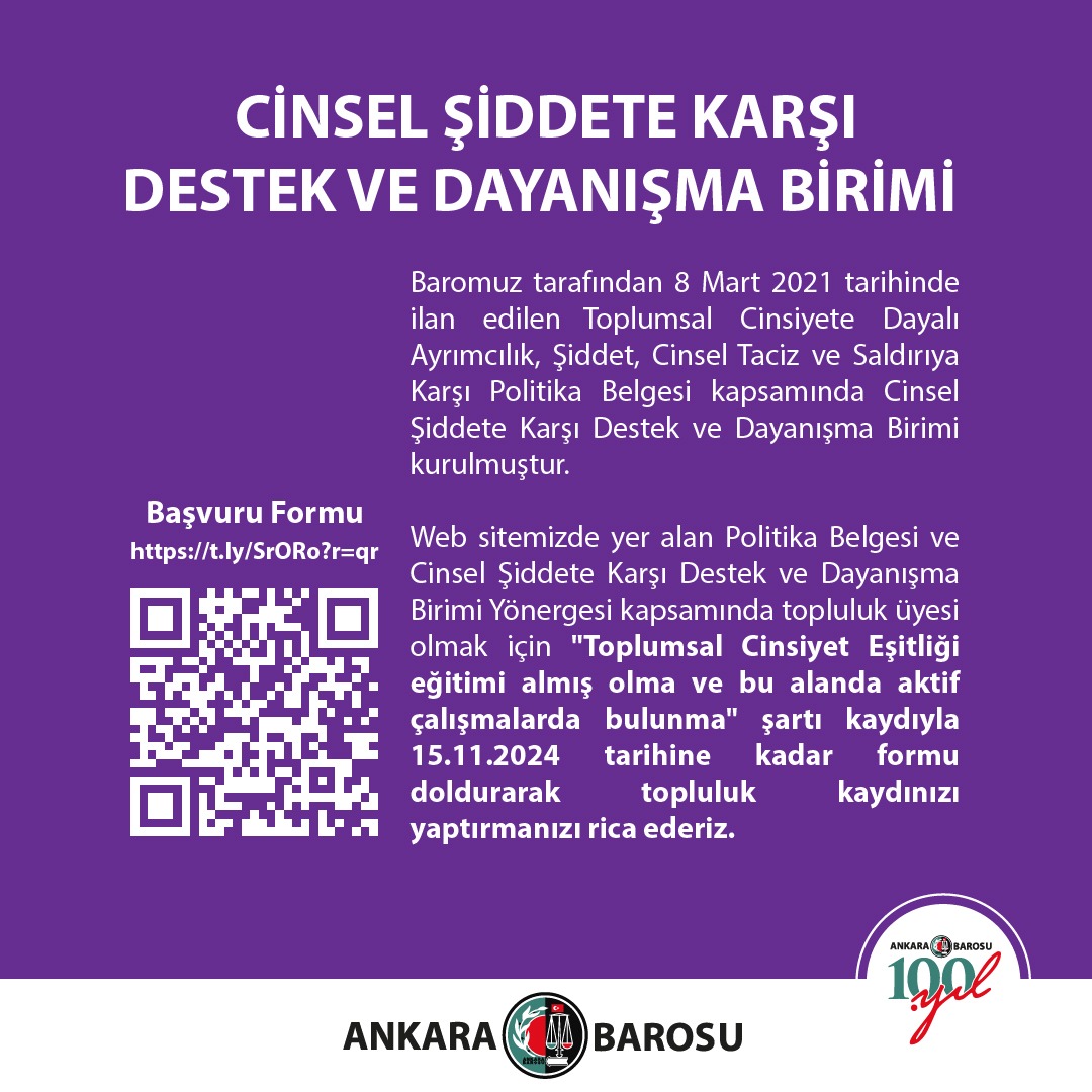 Web sitemizde yer alan Politika Belgesi ve Cinsel Şiddete Karşı Destek ve Dayanışma Birimi Yönergesi kapsamında topluluk üyesi olmak için "Toplumsal Cinsiyet Eşitliği eğitimi almış olma ve bu alanda aktif çalışmalarda bulunma" şartı kaydıyla 15.11.2024 tarihine kadar https://t.ly/SrORo linkindeki formu doldurarak topluluk kaydınızı yaptırmanızı rica ederiz.