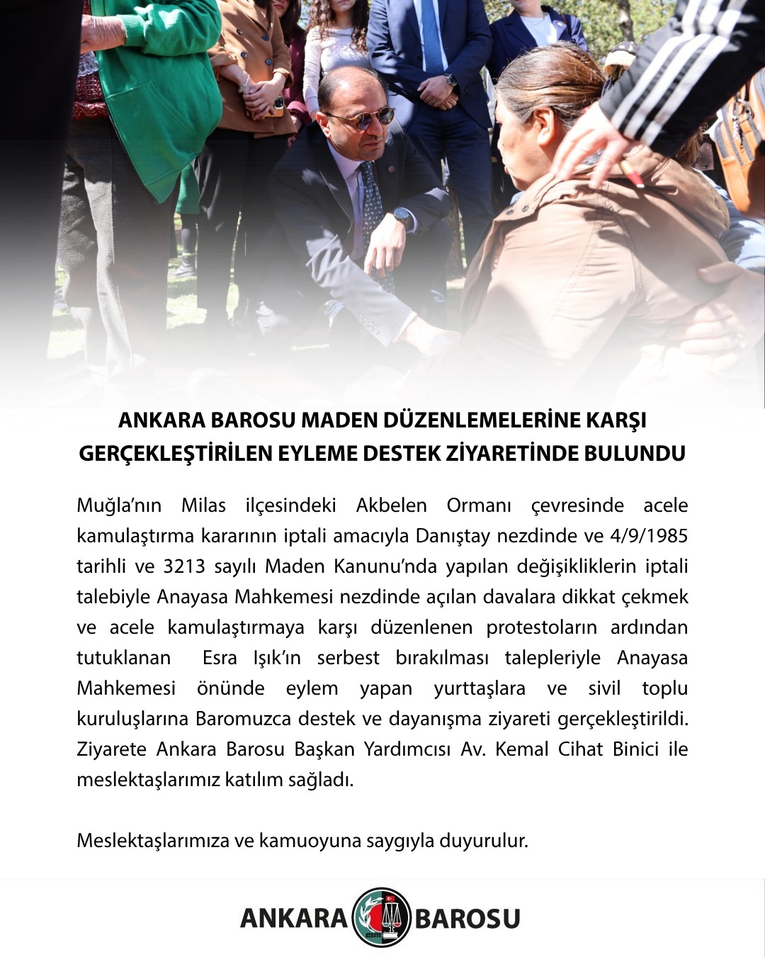 Muğla’nın Milas ilçesindeki Akbelen Ormanı çevresinde acele kamulaştırma kararının iptali amacıyla Danıştay nezdinde ve 4/9/1985 tarihli ve 3213 sayılı Maden Kanunu’nda yapılan değişikliklerin iptali talebiyle Anayasa Mahkemesi nezdinde açılan davalara dikkat çekmek ve acele kamulaştırmaya karşı düzenlenen protestoların ardından tutuklanan Esra Işık’ın serbest bırakılması talepleriyle Anayasa Mahkemesi önünde eylem yapan yurttaşlara ve sivil toplu kuruluşlarına Baromuzca destek ve dayanışma ziyareti gerçekleştirildi. Ziyarete Ankara Barosu Başkan Yardımcısı Av. Kemal Cihat Binici ile meslektaşlarımız katılım sağladı.