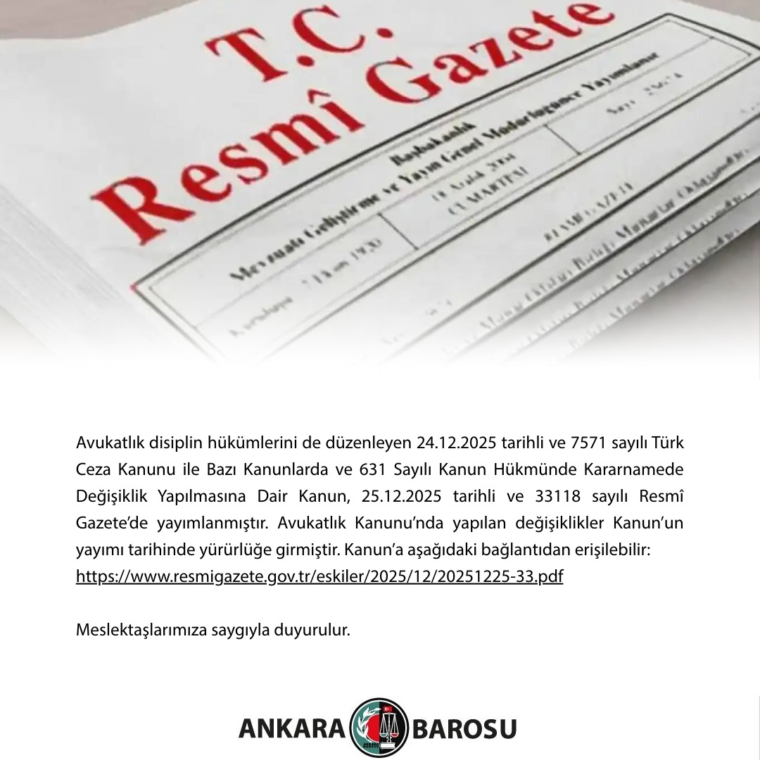 Avukatlık disiplin hükümlerini de düzenleyen 24.12.2025 tarihli ve 7571 sayılı Türk Ceza Kanunu ile Bazı Kanunlarda ve 631 Sayılı Kanun Hükmünde Kararnamede Değişiklik Yapılmasına Dair Kanun, 25.12.2025 tarihli ve 33118 sayılı Resmî Gazete’de yayımlanmıştır. Avukatlık Kanunu’nda yapılan değişiklikler Kanun’un yayımı tarihinde yürürlüğe girmiştir.