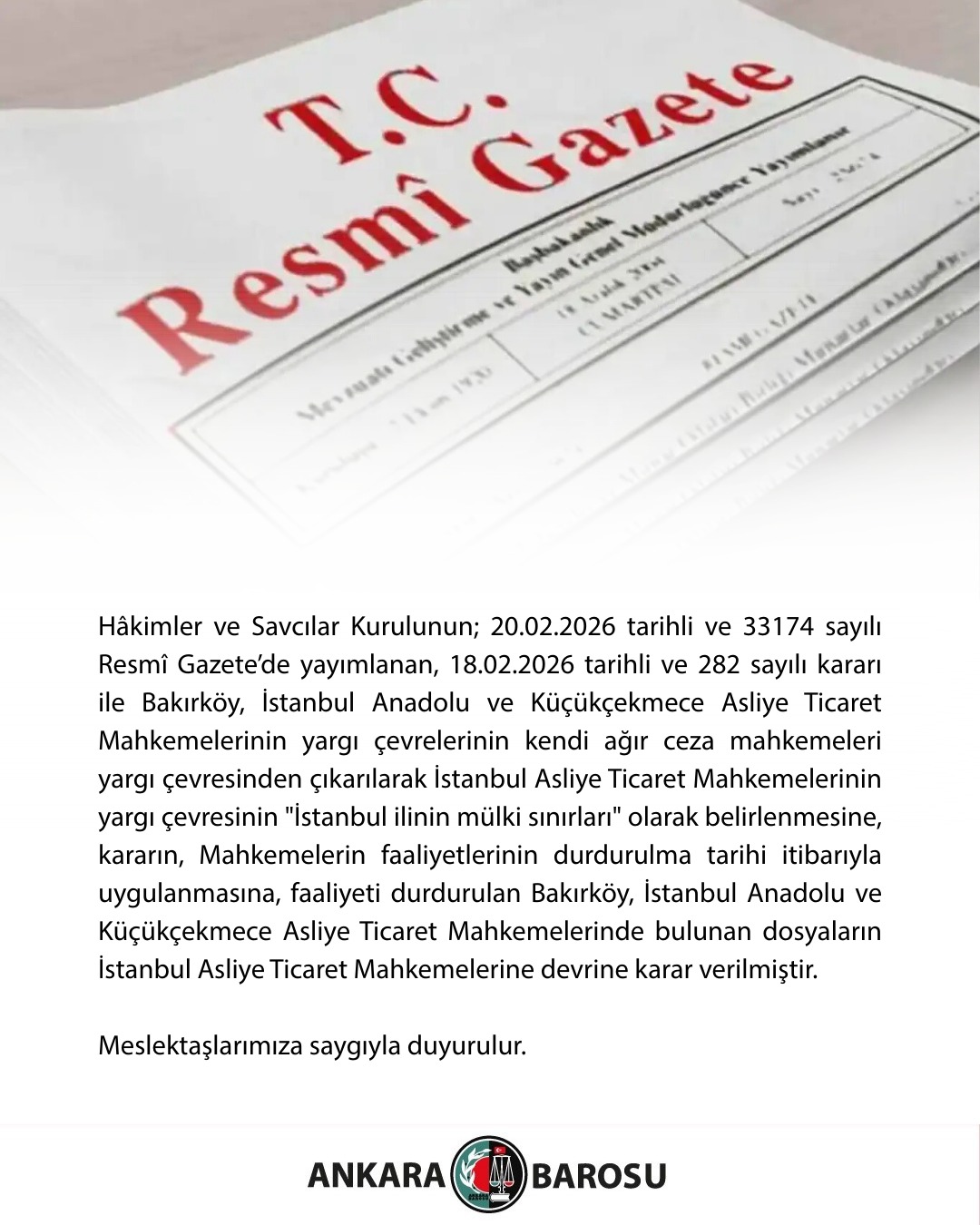 HÂKİMLER VE SAVCILAR KURULUNUN; 20.02.2026 TARİHLİ VE 33174 SAYILI RESMÎ GAZETE’DE YAYIMLANAN, 18.02.2026 TARİHLİ VE 282 SAYILI KARARI İLE BAKIRKÖY, İSTANBUL ANADOLU VE KÜÇÜKÇEKMECE ASLİYE TİCARET MAHKEMELERİNİN YARGI ÇEVRELERİNİN KENDİ AĞIR CEZA MAHKEMELERİ YARGI ÇEVRESİNDEN ÇIKARILARAK İSTANBUL ASLİYE TİCARET MAHKEMELERİNİN YARGI ÇEVRESİNİN "İSTANBUL İLİNİN MÜLKİ SINIRLARI" OLARAK BELİRLENMESİNE, KARARIN, MAHKEMELERİN FAALİYETLERİNİN DURDURULMA TARİHİ İTİBARIYLA UYGULANMASINA, FAALİYETİ DURDURULAN BAKIRKÖY, İSTANBUL ANADOLU VE KÜÇÜKÇEKMECE ASLİYE TİCARET MAHKEMELERİNDE BULUNAN DOSYALARIN İSTANBUL ASLİYE TİCARET MAHKEMELERİNE DEVRİNE KARAR VERİLMİŞTİR.