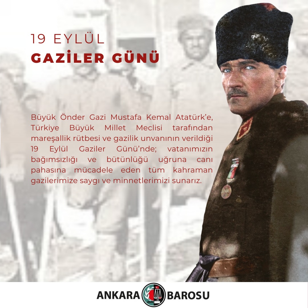 BÜYÜK ÖNDER GAZİ MUSTAFA KEMAL ATATÜRK’E, TÜRKİYE BÜYÜK MİLLET MECLİSİ TARAFINDAN MAREŞALLİK RÜTBESİ VE GAZİLİK UNVANININ VERİLDİĞİ 19 EYLÜL GAZİLER GÜNÜ’NDE; VATANIMIZIN BAĞIMSIZLIĞI VE BÜTÜNLÜĞÜ UĞRUNA CANI PAHASINA MÜCADELE EDEN TÜM KAHRAMAN GAZİLERİMİZE SAYGI VE MİNNETLERİMİZİ SUNARIZ