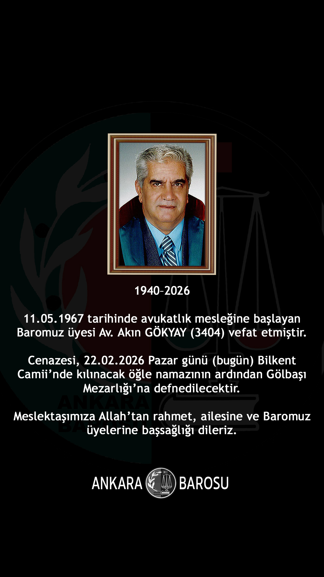 11.05.1967 tarihinde avukatlık mesleğine başlayan Baromuz üyesi Av. Akın GÖKYAY (3404) vefat etmiştir. Cenazesi, 22.02.2026 Pazar günü (bugün) Bilkent Camii’nde kılınacak öğle namazının ardından Gölbaşı Mezarlığı’na defnedilecektir. Meslektaşımıza Allah'tan rahmet, ailesine ve Baromuz üyelerine başsağlığı dileriz.