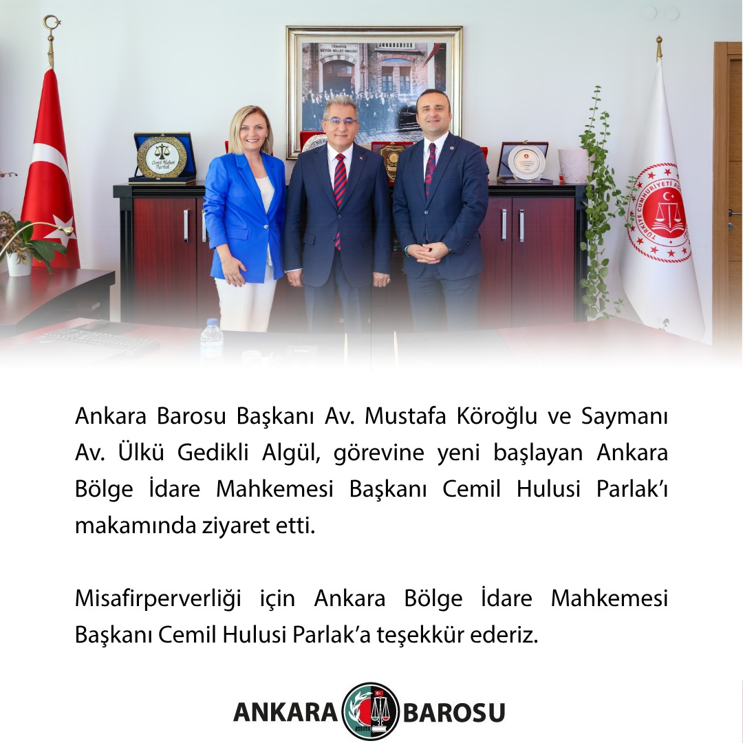 ANKARA BAROSU BAŞKANI AV. MUSTAFA KÖROĞLU VE SAYMANI AV. ÜLKÜ GEDİKLİ ALGÜL, GÖREVİNE YENİ BAŞLAYAN ANKARA BÖLGE İDARE MAHKEMESİ DAİRE BAŞKANI CEMİL HULUSİ PARLAK'I MAKAMINDA ZİYARET ETTİ