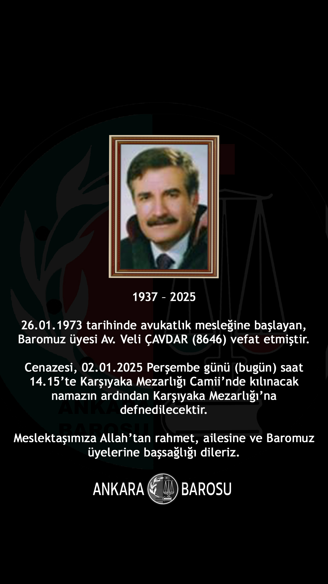 BAROMUZ ÜYESİ AV. VELİ ÇAVDAR (8646) VEFAT ETMİŞTİR.