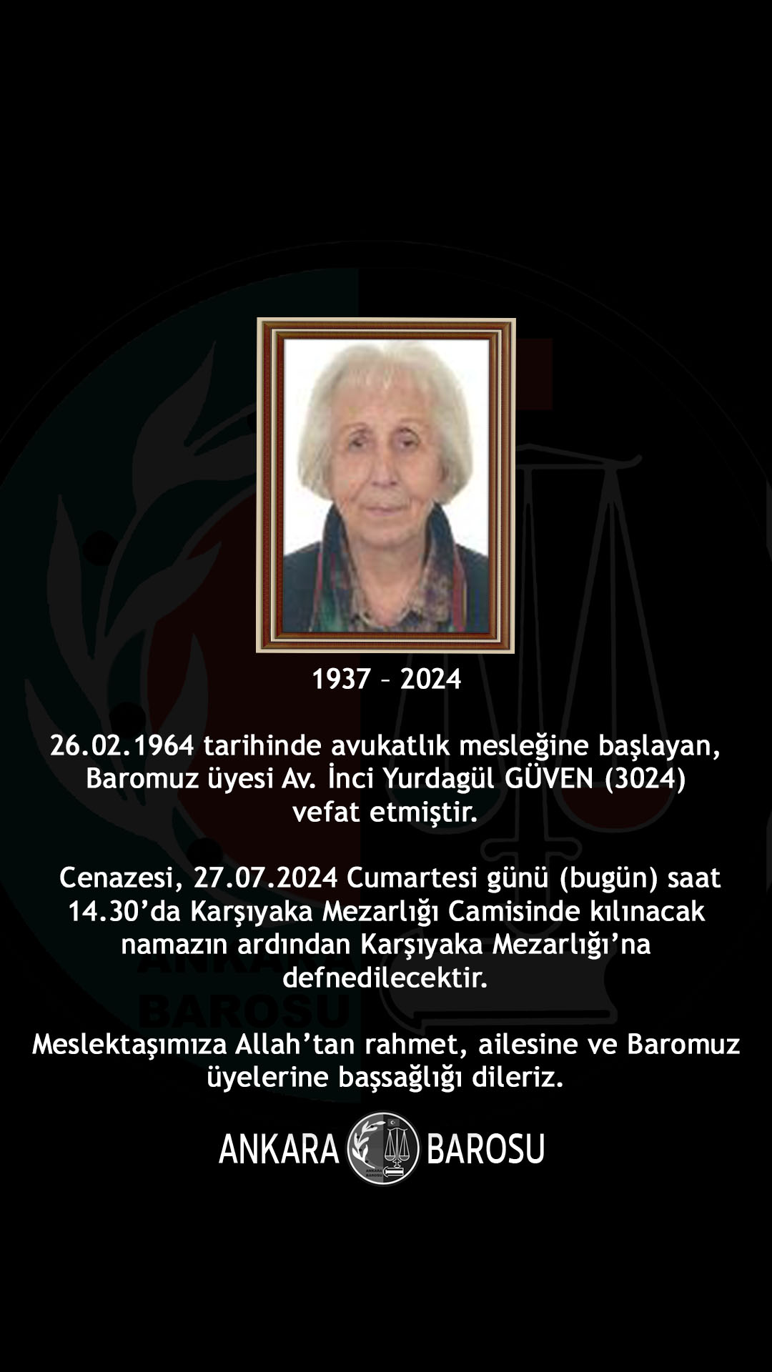 BAROMUZ ÜYESİ AV. İNCİ YURDAGÜL GÜVEN (3024) VEFAT ETMİŞTİR.