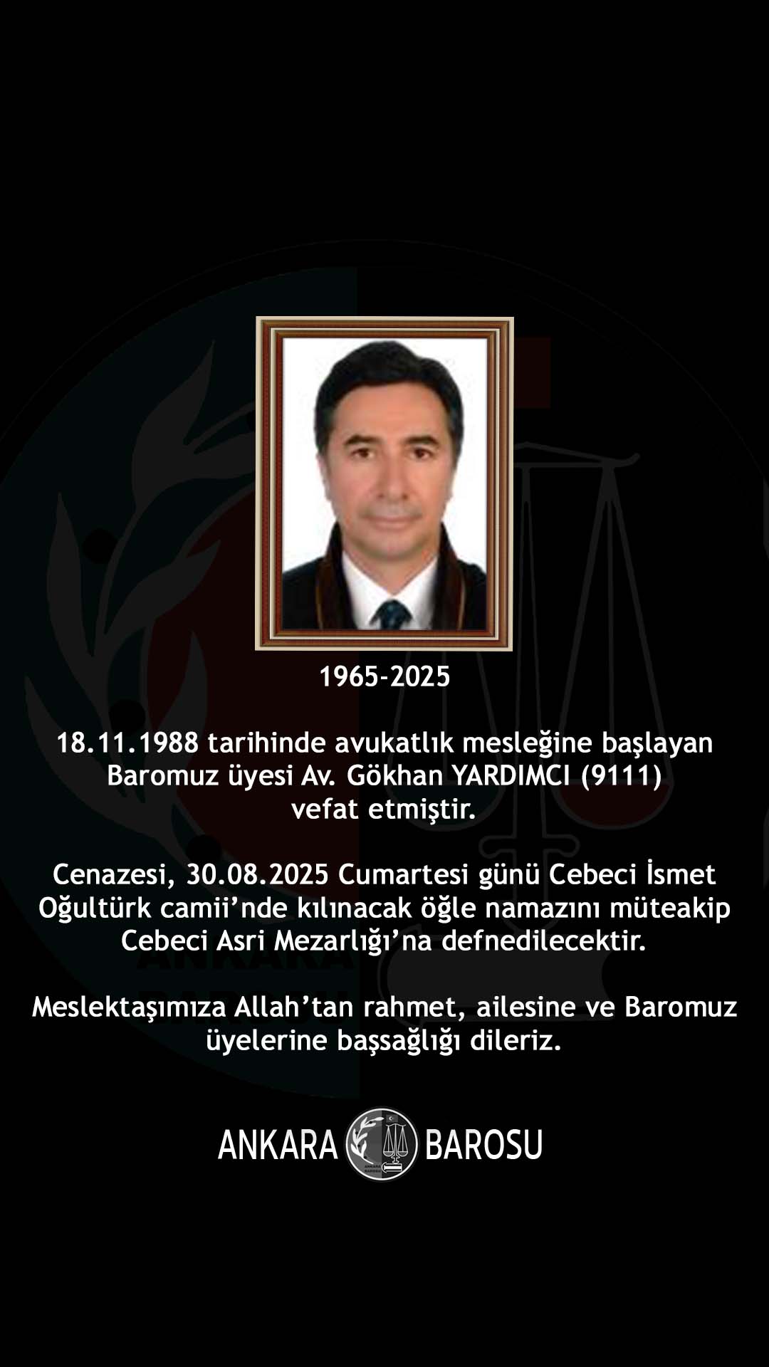 BAROMUZ ÜYESİ AV. GÖKHAN YARDIMCI (9111) VEFAT ETMİŞTİR