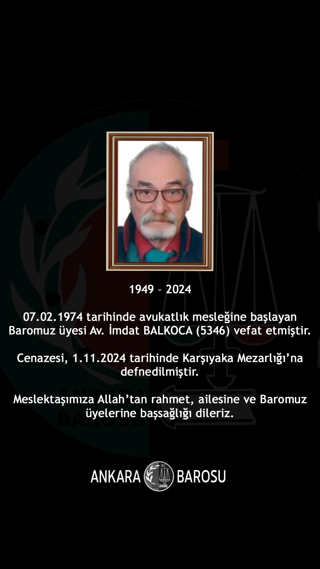 07.02.1974 tarihinde avukatlık mesleğine başlayan Baromuz üyesi Av. İmdat BALKOCA (5346) vefat etmiştir. Cenazesi, 1.11.2024 tarihinde Karşıyaka Mezarlığı’na defnedilmiştir. Meslektaşımıza Allah’tan rahmet, ailesine ve Baromuz üyelerine başsağlığı dileriz.