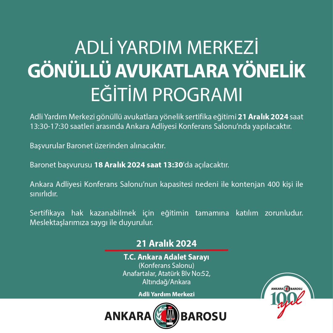 Adli Yardım Merkezi gönüllü avukatlara yönelik sertifika eğitimi 21 Aralık 2024 saat 13:30-17:30 saatleri arasında Ankara Adliyesi Konferans salonunda yapılacaktır. Başvurular Baronet üzerinden alınacaktır. Baronet başvurusu 18 Aralık 2024 saat 13:30'da açılacaktır. Ankara Adliyesi Konferans salonunun kapasitesi nedeni ile kontenjan 400 kişi ile sınırlıdır. Sertifikaya hak kazanabilmek için eğitimin tamamına katılım zorunludur. Meslektaşlarımıza saygı ile duyurulur.