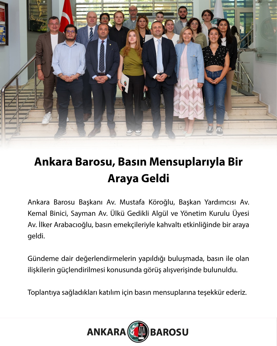 Ankara Barosu Başkanı Av. Mustafa Köroğlu, Başkan Yardımcısı Av. Kemal Binici, Sayman Av. Ülkü Gedikli Algül ve Yönetim Kurulu Üyesi Av. İlker Arabacıoğlu, basın emekçileriyle kahvaltı etkinliğinde bir araya geldi.