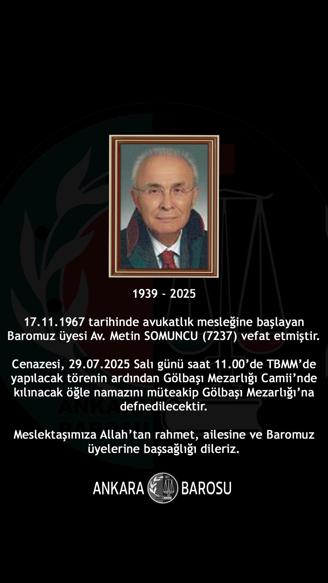 17.11.1967 tarihinde avukatlık mesleğine başlayan Baromuz üyesi Av. Metin SOMUNCU (7237) vefat etmiştir. Cenazesi, 29.07.2025 Salı günü saat 11.00’de TBMM’de yapılacak törenin ardından Gölbaşı Mezarlığı Camii’nde kılınacak öğle namazını müteakip Gölbaşı Mezarlığı’na defnedilecektir. Meslektaşımıza Allah'tan rahmet, ailesine ve Baromuz üyelerine başsağlığı dileriz.
