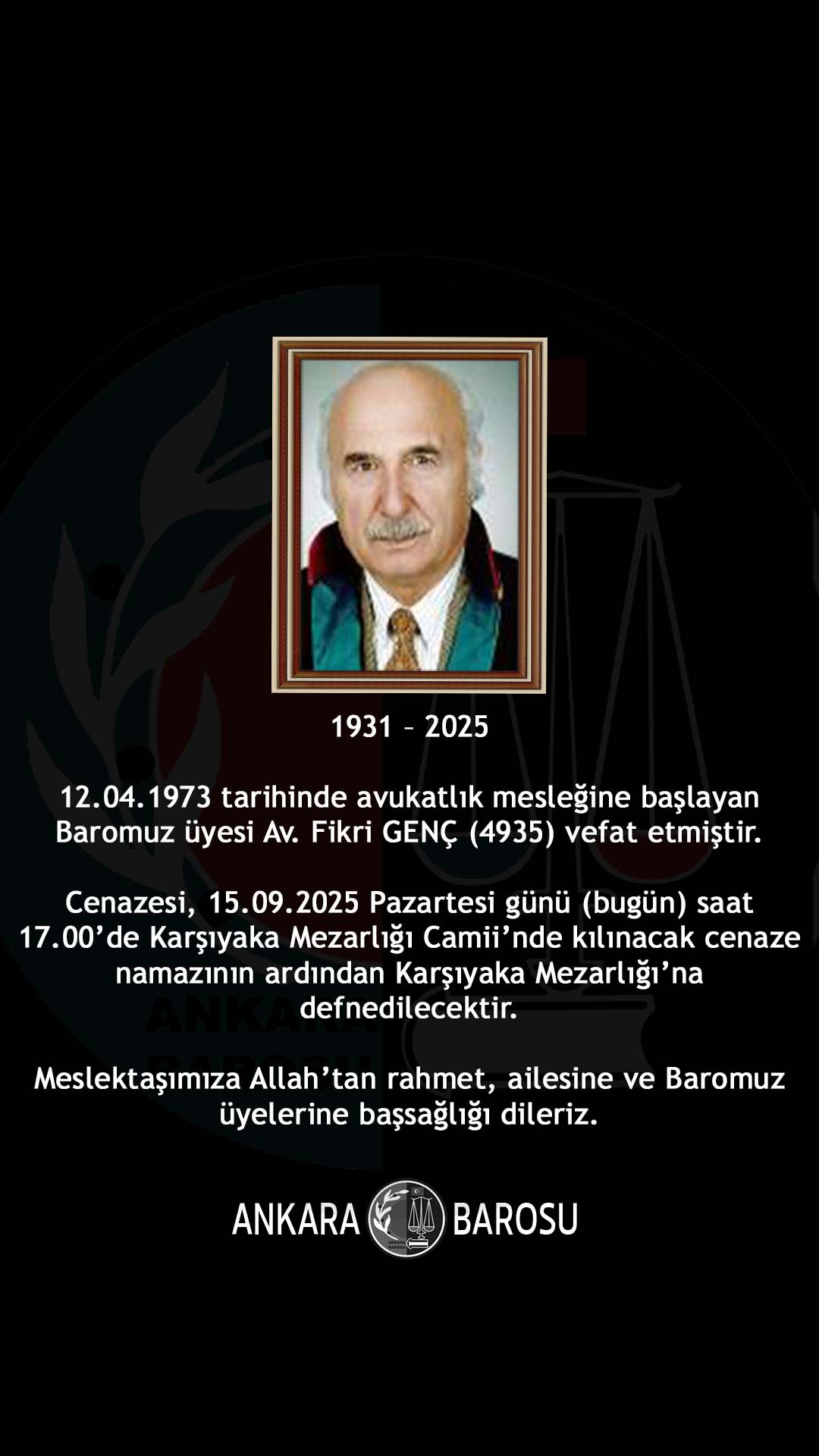 12.04.1973 tarihinde avukatlık mesleğine başlayan Baromuz üyesi Av. Fikri GENÇ (4935) vefat etmiştir. Cenazesi, 15.09.2025 Pazartesi günü (bugün) saat 17.00’de Karşıyaka Mezarlığı Camii’nde kılınacak cenaze namazının ardından Karşıyaka Mezarlığı’na defnedilecektir. Meslektaşımıza Allah'tan rahmet, ailesine ve Baromuz üyelerine başsağlığı dileriz.