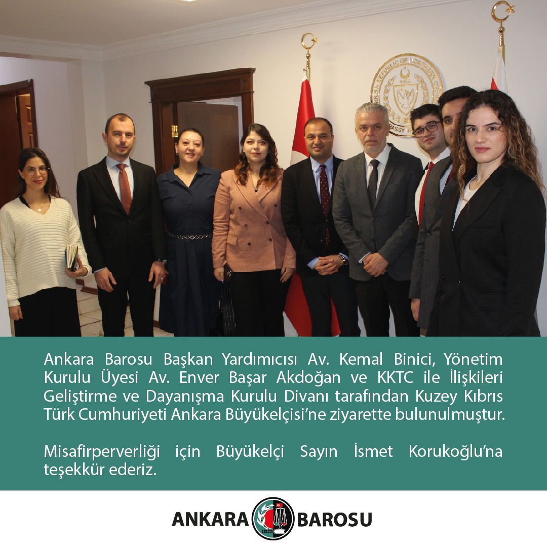 ANKARA BAROSU BAŞKAN YARDIMCISI AV. KEMAL BİNİCİ, YÖNETİM KURULU ÜYESİ AV. ENVER BAŞAR AKDOĞAN VE KKTC İLE İLİŞKİLERİ GELİŞTİRME VE DAYANIŞMA KURULU DİVANI TARAFINDAN KUZEY KIBRIS TÜRK CUMHURİYETİ ANKARA BÜYÜKELÇİSİ’NE ZİYARETTE BULUNULMUŞTUR. MİSAFİRPERVERLİĞİ İÇİN BÜYÜKELÇİ SAYIN İSMET KORUKOĞLU’NA TEŞEKKÜR EDERİZ