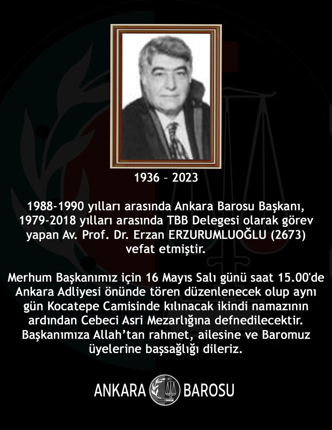 1988-1990 YILLARI ARASINDA ANKARA BAROSU BAŞKANI, 1979-2018 YILLARI ARASINDA TBB DELEGESİ OLARAK GÖREV YAPAN AV. PROF. DR. ERZAN ERZURUMLUOĞLU (2673) VEFAT ETMİŞTİR