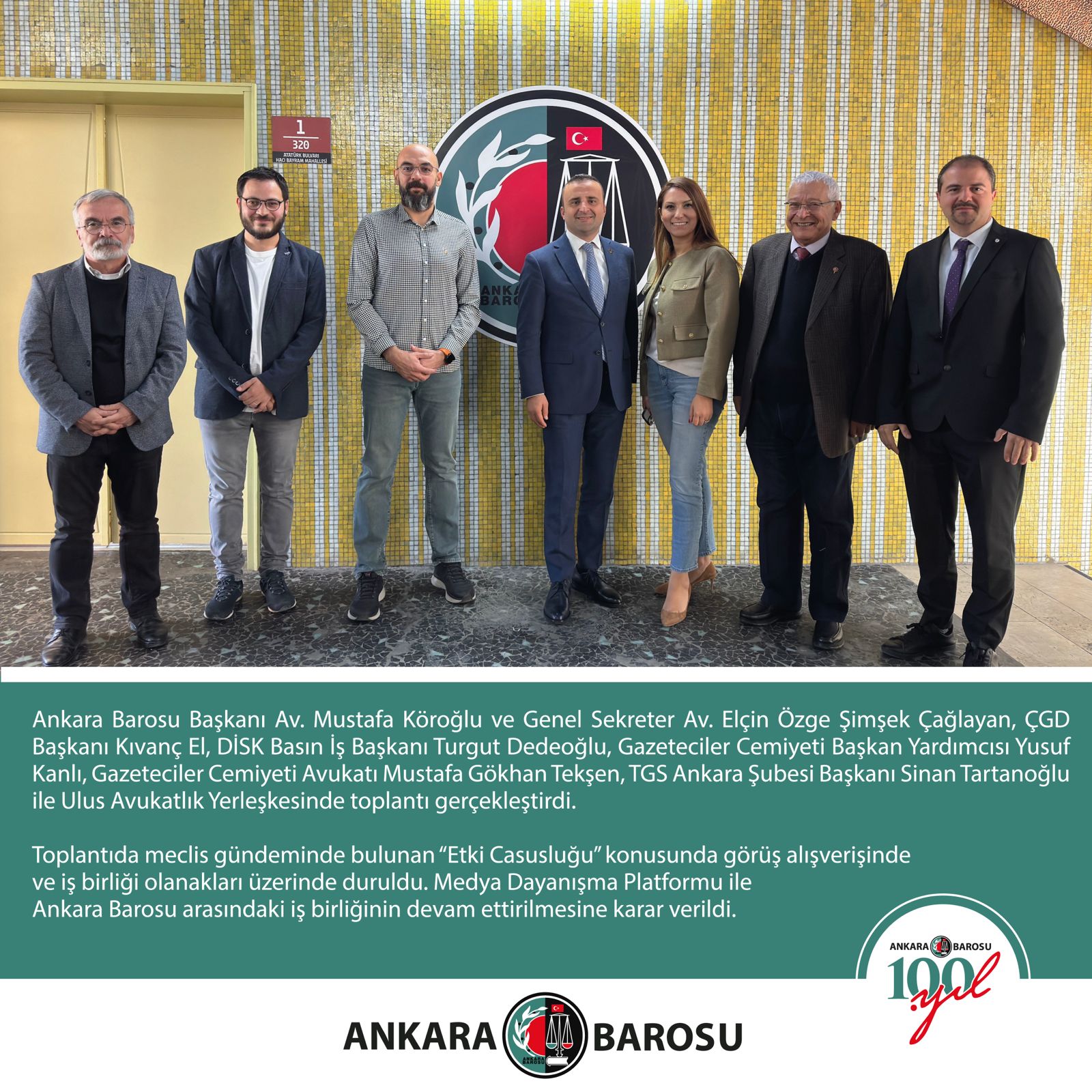 Ankara Barosu Başkanı Av. Mustafa Köroğlu ve Genel Sekreter Av. Elçin Özge Şimşek Çağlayan, ÇGD Başkanı Kıvanç El, DİSK Basın İş Başkanı Turgut Dedeoğlu, Gazeteciler Cemiyeti Başkan Yardımcısı Yusuf Kanlı, Gazeteciler Cemiyeti Avukatı Mustafa Gökhan Tekşen, TGS Ankara Şubesi Başkanı Sinan Tartanoğlu ile Ulus Avukatlık Yerleşkesinde toplantı gerçekleştirdi.