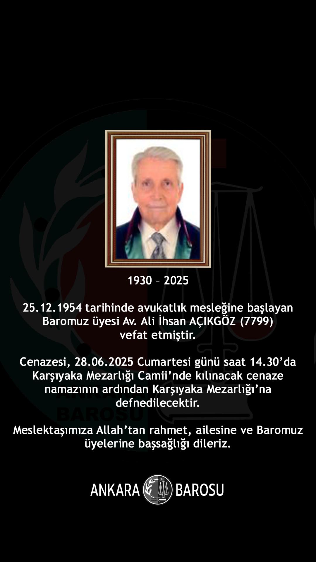 BAROMUZ ÜYESİ AV. ALİ İHSAN AÇIKGÖZ (7799) VEFAT ETMİŞTİR.