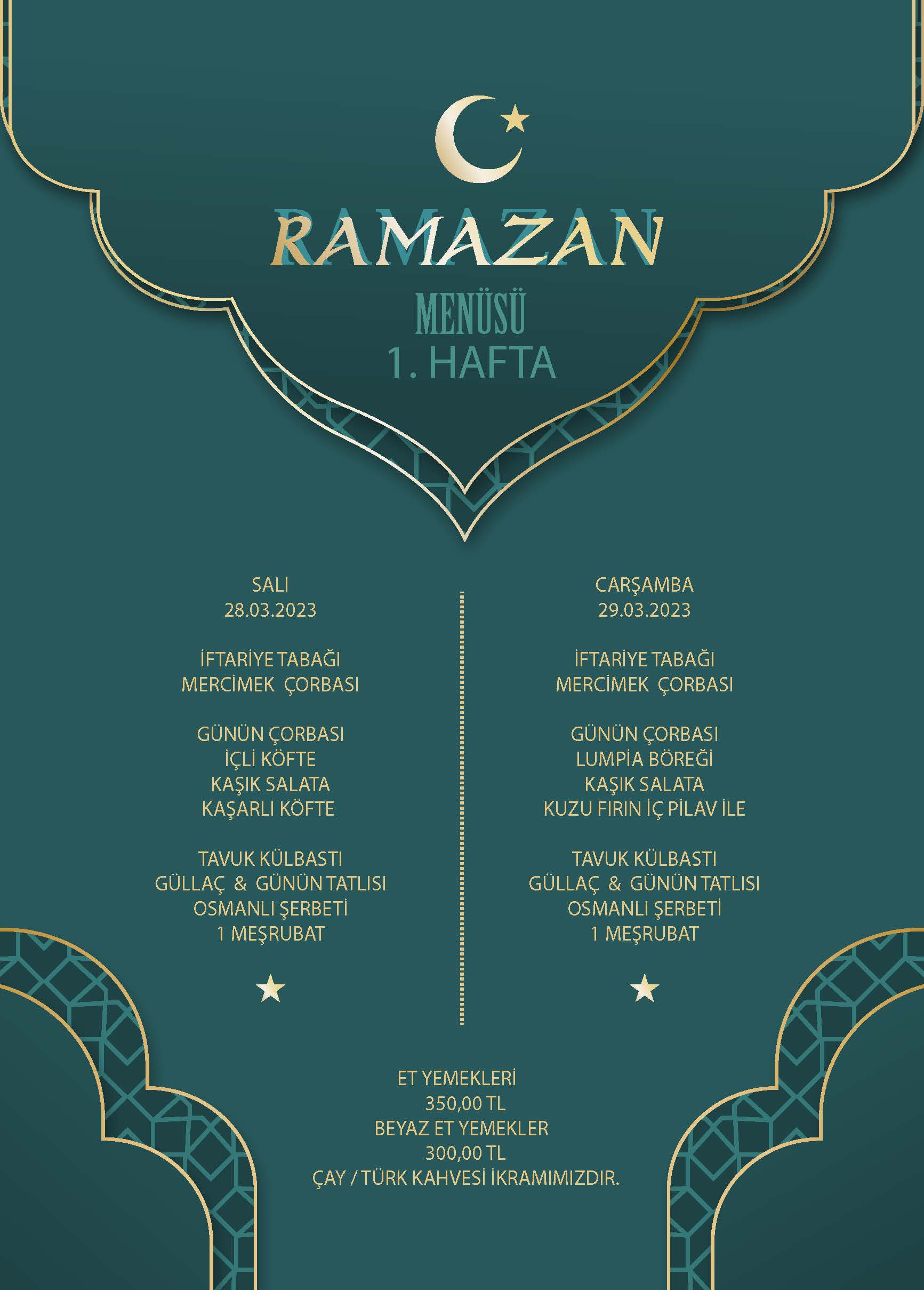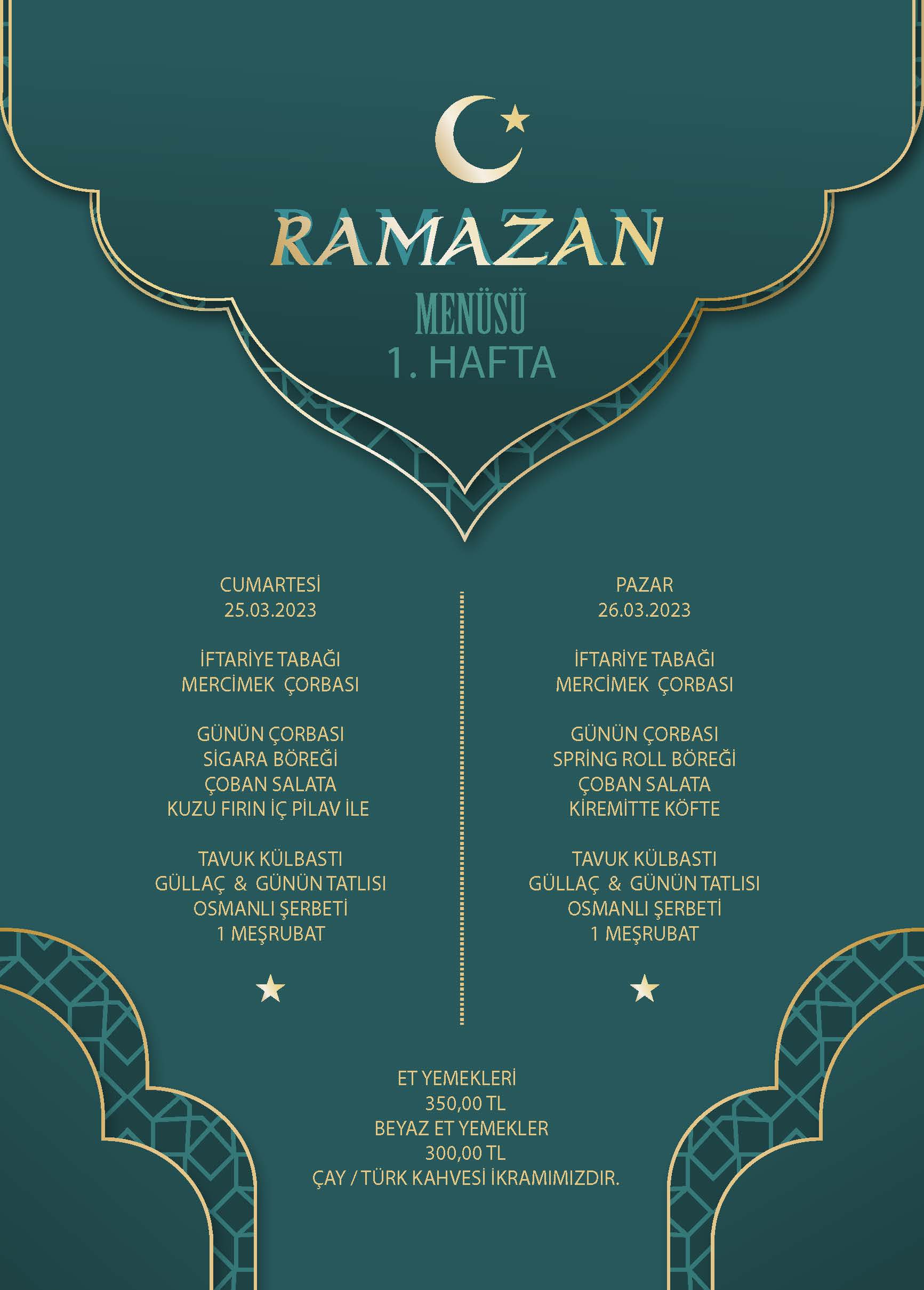 Ankara Barosu Av. Özdemir Özok Sosyal Tesisi Gölbaşı 23 Mart 2023 Perşembe - 29 Mart 2023 Çarşamba tarihleri arasındaki Ramazan birinci haftası iftar menüleri