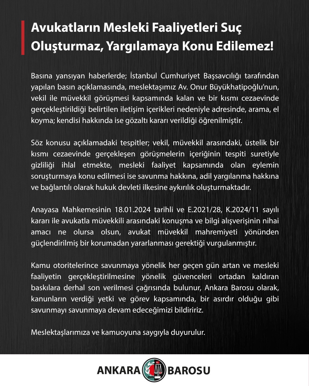 Basına yansıyan haberlerde; İstanbul Cumhuriyet Başsavcılığı tarafından yapılan basın açıklamasında, meslektaşımız Av. Onur Büyükhatipoğlu’nun, vekil ile müvekkil görüşmesi kapsamında kalan ve bir kısmı cezaevinde gerçekleştirildiği belirtilen iletişim içerikleri nedeniyle adresinde, arama, el koyma; kendisi hakkında ise gözaltı kararı verildiği öğrenilmiştir.