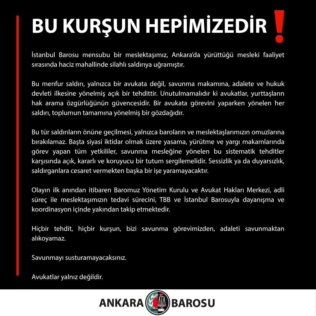 İstanbul Barosu mensubu bir meslektaşımız, Ankara’da yürüttüğü mesleki faaliyet sırasında haciz mahallinde silahlı saldırıya uğramıştır.