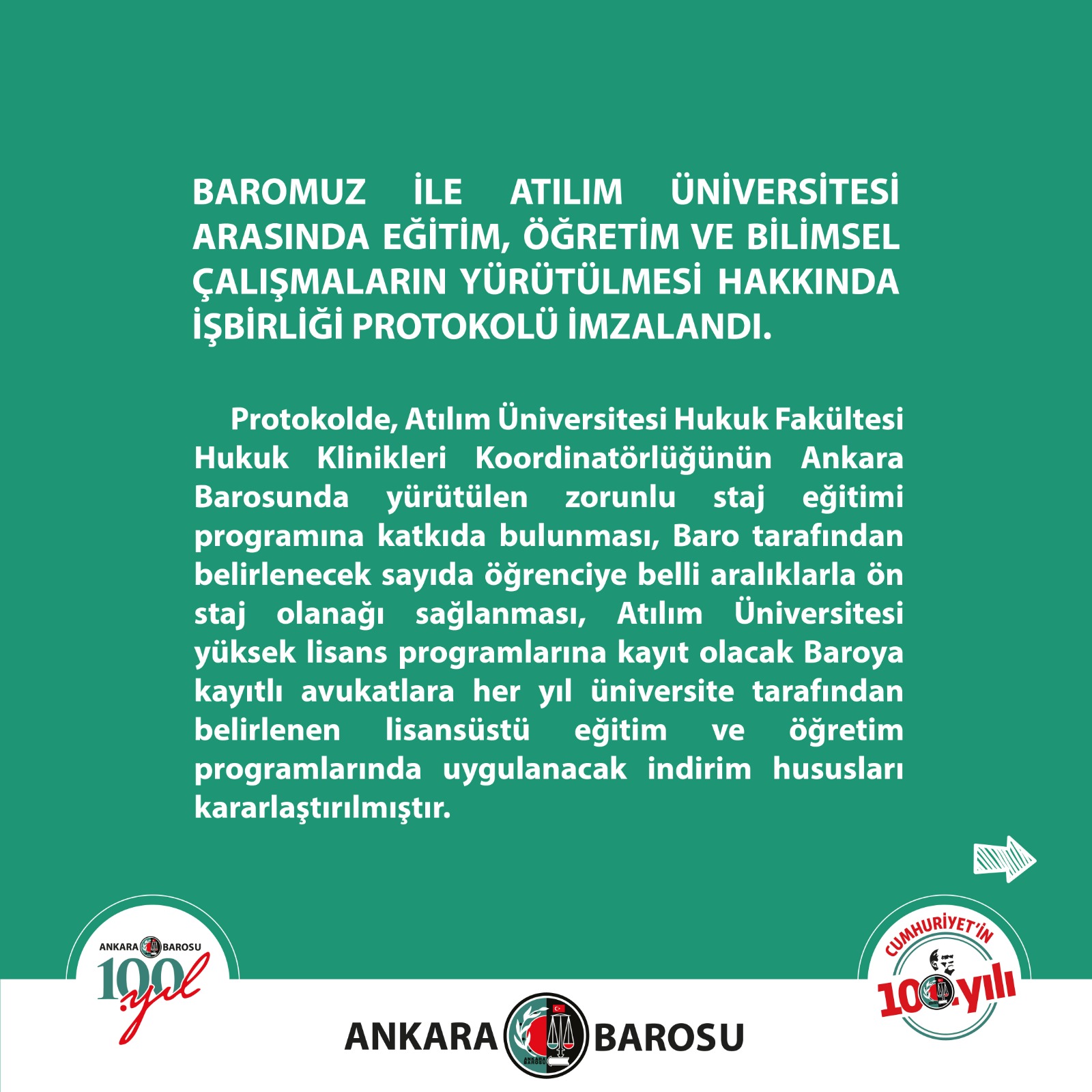 Protokolde, Atılım Üniversitesi Hukuk Fakültesi Hukuk Klinikleri Koordinatörlüğünün Ankara Barosunda yürütülen zorunlu staj eğitimi programına katkıda bulunması, Baro tarafından belirlenecek sayıda öğrenciye belli aralıklarla ön staj olanağı sağlanması, Atılım Üniversitesi yüksek lisans programlarına kayıt olacak Baroya kayıtlı avukatlara her yıl üniversite tarafından belirlenen lisansüstü eğitim ve öğretim programlarında uygulanacak indirim hususları kararlaştırılmıştır.