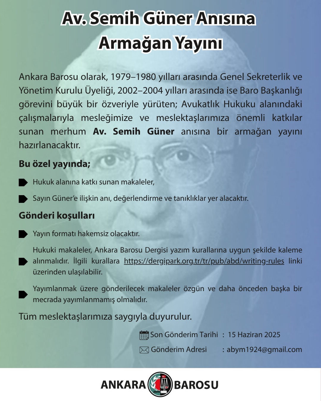 Ankara Barosu olarak, 1979–1980 yıllarında Genel Sekreterlik ve Yönetim Kurulu Üyeliği, 2002–2004 yılları arasında ise Baro Başkanlığı görevini büyük bir özveriyle yürüten; Avukatlık Hukuku alanındaki çalışmalarıyla mesleğimize ve meslektaşlarımıza önemli katkılar sunan merhum Av. Semih Güner anısına bir armağan yayını hazırlanacaktır.