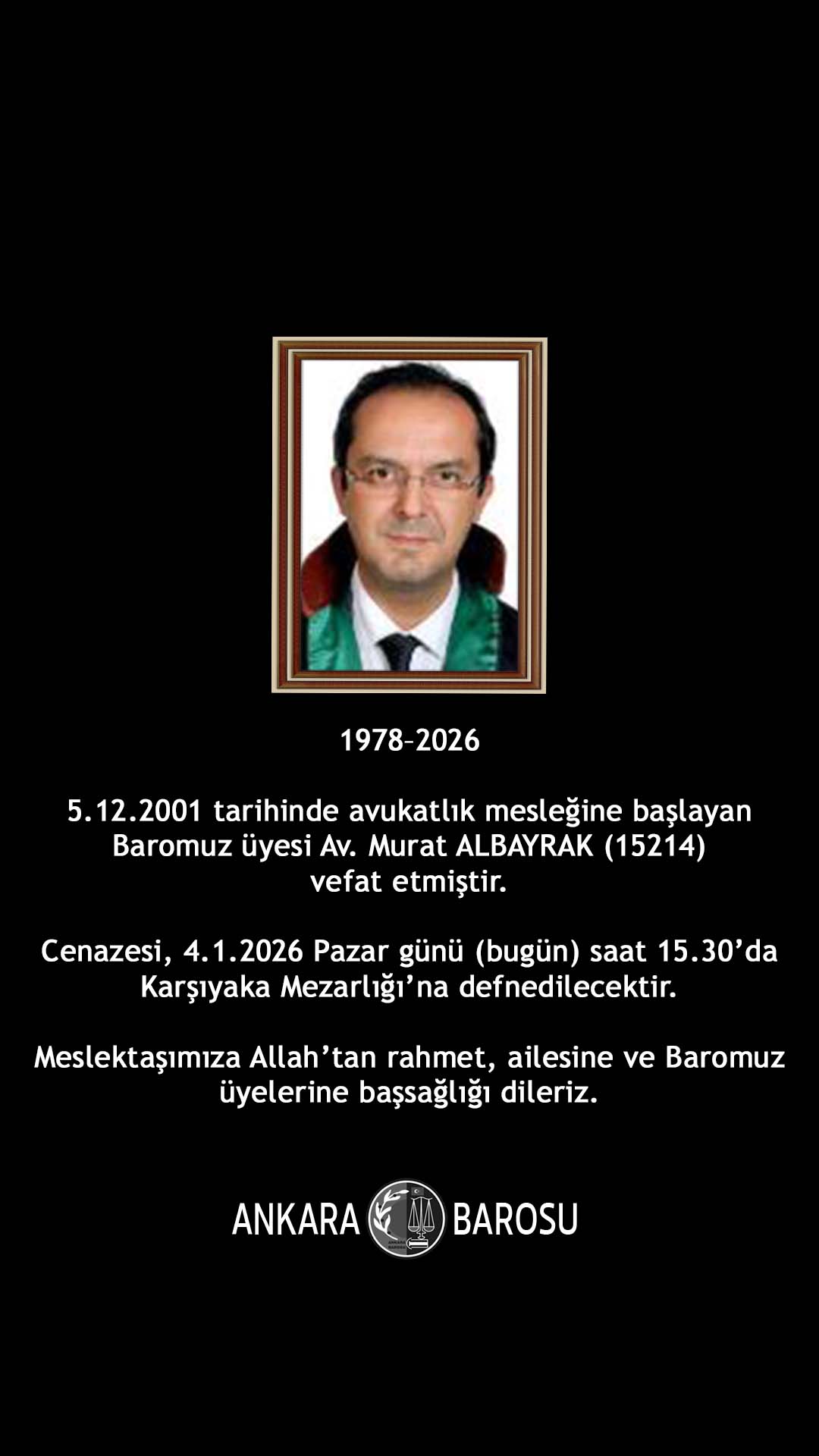 5.12.2001 tarihinde avukatlık mesleğine başlayan Baromuz üyesi Av. Murat ALBAYRAK (15214) vefat etmiştir. Cenazesi, 4.1.2026 Pazar günü (bugün) saat 15.30’da Karşıyaka Mezarlığı’na defnedilecektir. Meslektaşımıza Allah'tan rahmet, ailesine ve Baromuz üyelerine başsağlığı dileriz.