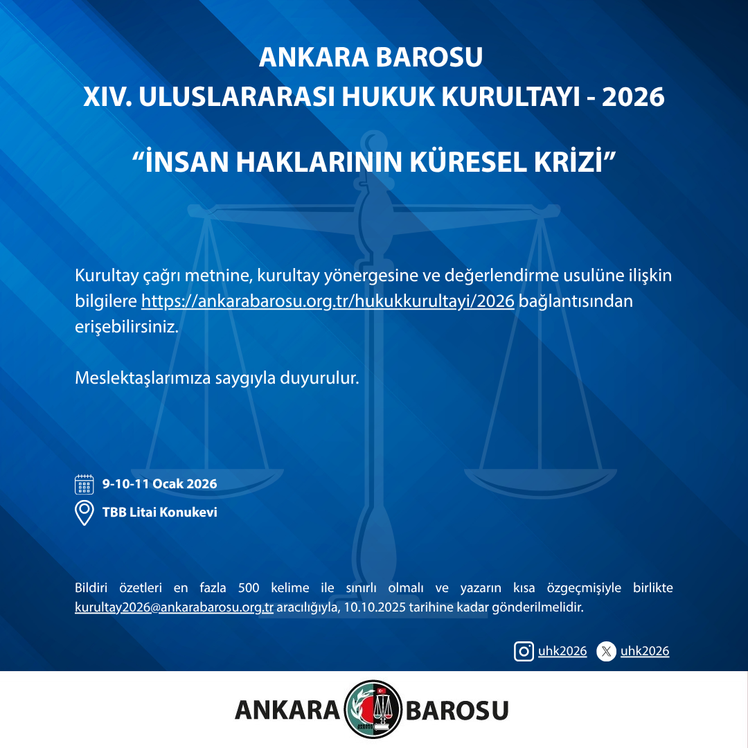 ANKARA BAROSU XIV. ULUSLARARASI HUKUK KURULTAYI “İNSAN HAKLARININ KÜRESEL KRİZİ” ANA BAŞLIĞI İLE 9-10-11 OCAK 2026 TARİHLERİNDE ANKARA'DA GERÇEKLEŞTİRİLECEKTİR.