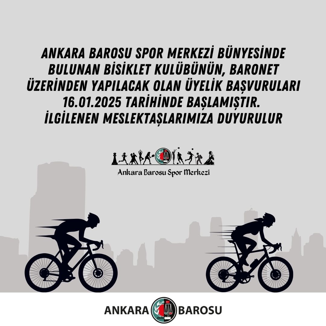 ANKARA BAROSU SPOR MERKEZİ BÜNYESİNDE BULUNAN BİSİKLET KULÜBÜNÜN, BARONET ÜZERİNDEN YAPILACAK OLAN ÜYELİK BAŞVURULARI 16.01.2025 TARİHİNDE BAŞLAMIŞTIR