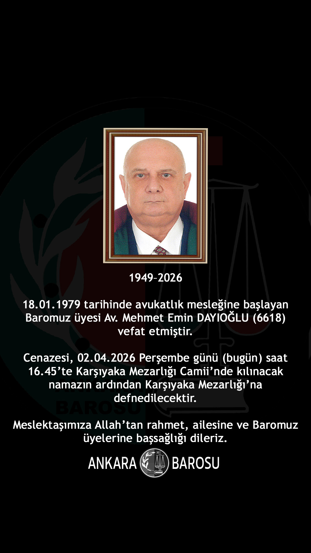 18.01.1979 tarihinde avukatlık mesleğine başlayan Baromuz üyesi Av. Mehmet Emin DAYIOĞLU (6618) vefat etmiştir. Cenazesi, 02.04.2026 Perşembe günü (bugün) saat 16.45’te Karşıyaka Mezarlığı Camii’nde kılınacak namazın ardından Karşıyaka Mezarlığı’na defnedilecektir. Meslektaşımıza Allah'tan rahmet, ailesine ve Baromuz üyelerine başsağlığı dileriz.