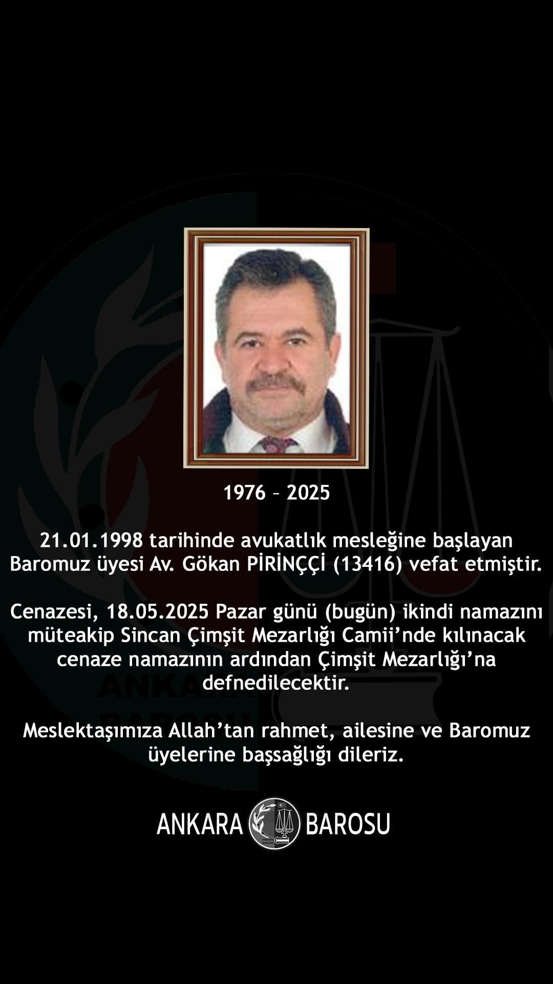 21.01.1998 tarihinde avukatlık mesleğine başlayan Baromuz üyesi Av. Gökan PİRİNÇÇİ (13416) vefat etmiştir. Cenazesi, 18.05.2025 Pazar günü (bugün) ikindi namazını müteakip Sincan Çimşit Mezarlığı Camii’nde kılınacak cenaze namazının ardından Çimşit Mezarlığı’na defnedilecektir. Meslektaşımıza Allah'tan rahmet, ailesine ve Baromuz üyelerine başsağlığı dileriz.