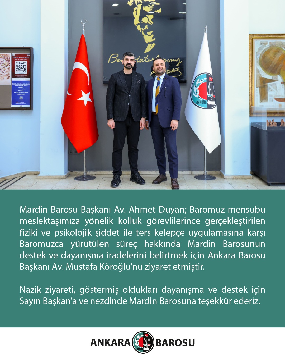 MARDİN BAROSU BAŞKANI AV. AHMET DUYAN; BAROMUZ MENSUBU MESLEKTAŞIMIZA YÖNELİK KOLLUK GÖREVLİLERİNCE GERÇEKLEŞTİRİLEN FİZİKİ VE PSİKOLOJİK ŞİDDET İLE TERS KELEPÇE UYGULAMASINA KARŞI BAROMUZCA YÜRÜTÜLEN SÜREÇ HAKKINDA MARDİN BAROSUNUN DESTEK VE DAYANIŞMA İRADELERİNİ BELİRTMEK İÇİN ANKARA BAROSU BAŞKANI AV. MUSTAFA KÖROĞLU’NU ZİYARET ETMİŞTİR.