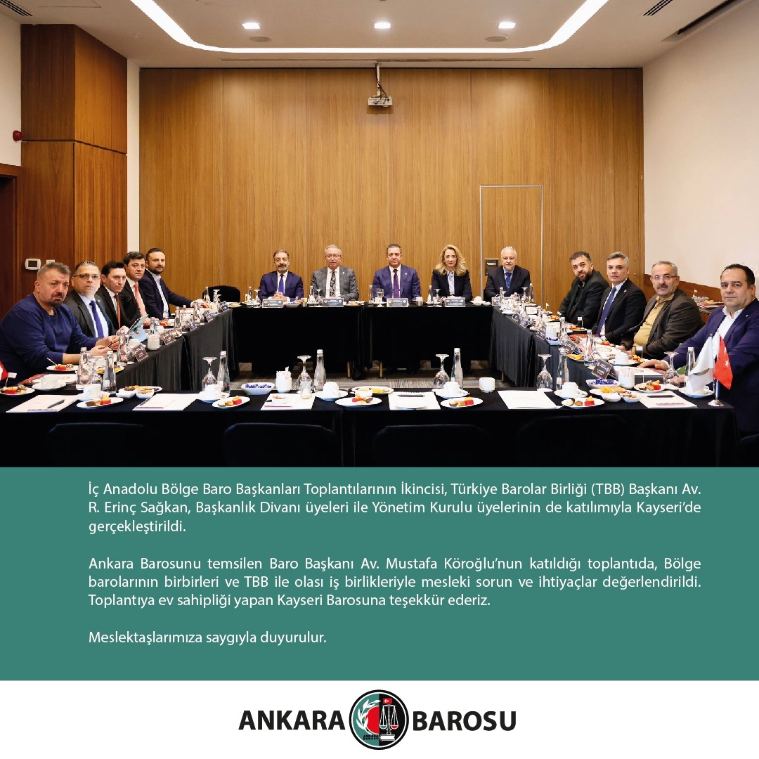 Ankara Barosunu temsilen Baro Başkanı Av. Mustafa Köroğlu’nun katıldığı toplantıda, Bölge barolarının birbirleri ve TBB ile olası iş birlikleriyle mesleki sorun ve ihtiyaçlar değerlendirildi. Toplantıya ev sahipliği yapan Kayseri Barosuna teşekkür ederiz.