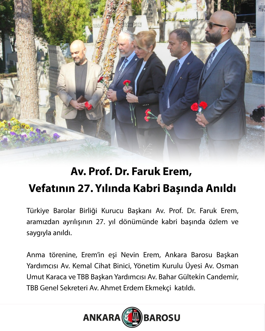 Türkiye Barolar Birliği Kurucu Başkanı Av. Prof. Dr. Faruk Erem, aramızdan ayrılışının 27. yıl dönümünde kabri başında özlem ve saygıyla anıldı.