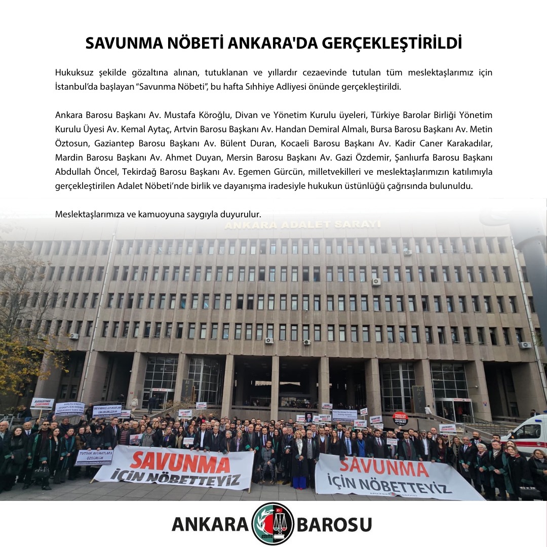 Ankara Barosu Başkanı Av. Mustafa Köroğlu, Divan ve Yönetim Kurulu üyeleri, Türkiye Barolar Birliği Yönetim Kurulu Üyesi Av. Kemal Aytaç, Artvin Barosu Başkanı Av. Handan Demiral Almalı, Bursa Barosu Başkanı Av. Metin Öztosun, Gaziantep Barosu Başkanı Av. Bülent Duran, Kocaeli Barosu Başkanı Av. Kadir Caner Karakadılar, Mardin Barosu Başkanı Av. Ahmet Duyan, Mersin Barosu Başkanı Av. Gazi Özdemir, Şanlıurfa Barosu Başkanı Abdullah Öncel, Tekirdağ Barosu Başkanı Av. Egemen Gürcün, milletvekilleri ve meslektaşlarımızın katılımıyla gerçekleştirilen Adalet Nöbeti’nde birlik ve dayanışma iradesiyle hukukun üstünlüğü çağrısında bulunuldu.