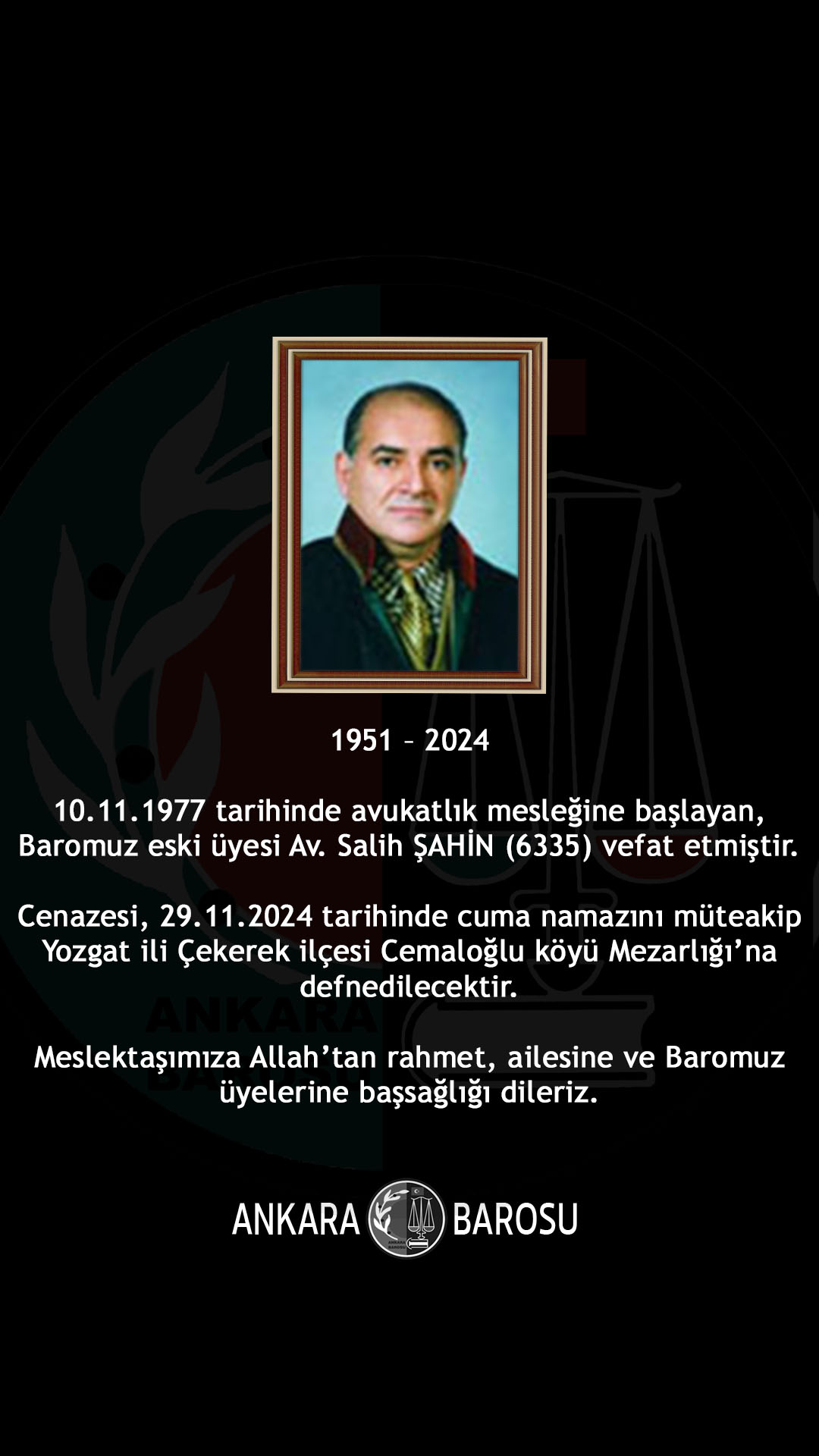 10.11.1977 tarihinde avukatlık mesleğine başlayan, Baromuz eski üyesi Av. Salih ŞAHİN (6335) vefat etmiştir. Cenazesi, 29.11.2024 tarihinde cuma namazını müteakip Yozgat ili Çekerek ilçesi Cemaloğlu köyü Mezarlığı’na defnedilecektir. Meslektaşımıza Allah'tan rahmet, ailesine ve Baromuz üyelerine başsağlığı dileriz.
