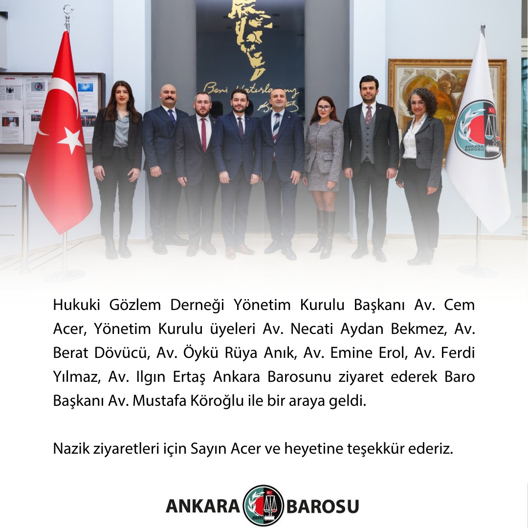 HUKUKİ GÖZLEM DERNEĞİ YÖNETİM KURULU BAŞKANI AV. CEM ACER, YÖNETİM KURULU ÜYELERİ AV. NECATİ AYDAN BEKMEZ, AV. BERAT DÖVÜCÜ, AV. ÖYKÜ RÜYA ANIK, AV. EMİNE EROL, AV. FERDİ YILMAZ, AV. ILGIN ERTAŞ ANKARA BAROSUNU ZİYARET EDEREK BARO BAŞKANI AV. MUSTAFA KÖROĞLU İLE BİR ARAYA GELDİ.