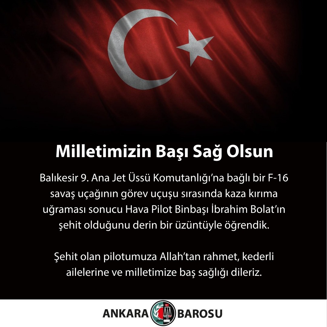 Balıkesir 9. Ana Jet Üssü Komutanlığı’na bağlı bir F-16 savaş uçağının görev uçuşu sırasında kaza kırıma uğraması sonucu Hava Pilot Binbaşı İbrahim Bolat’ın şehit olduğunu derin bir üzüntüyle öğrendik.