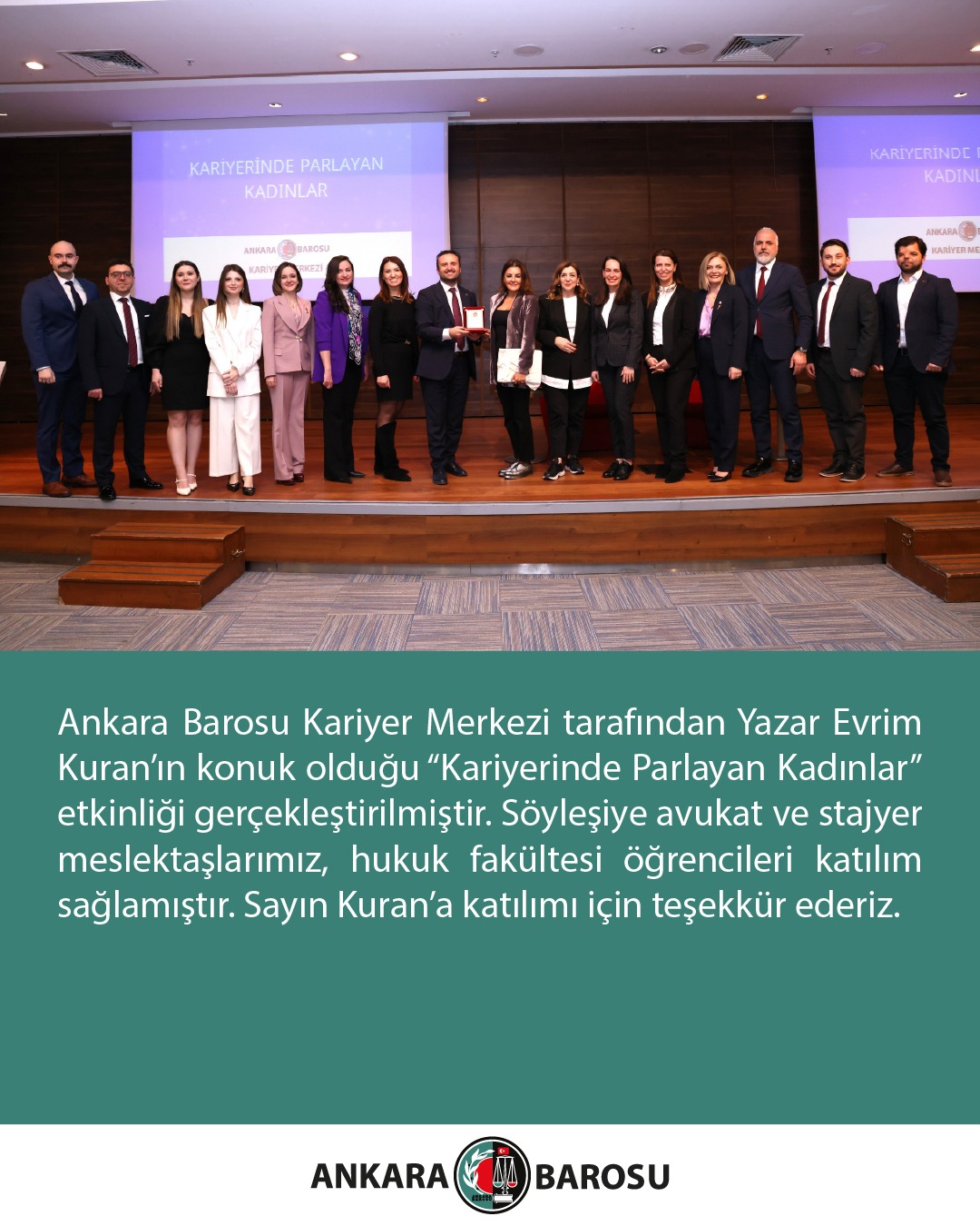 ANKARA BAROSU KARİYER MERKEZİ TARAFINDAN YAZAR EVRİM KURAN'IN KONUK OLDUĞU “KARİYERİNDE PARLAYAN KADINLAR" ETKİNLİĞİ GERÇEKLEŞTİRİLMİŞTİR. SÖYLEŞİYE AVUKAT VE STAJYER MESLEKTAŞLARIMIZ, HUKUK FAKÜLTESİ ÖĞRENCİLERİ KATILIM SAĞLAMIŞTIR. SAYIN KURAN'A KATILIMI İÇİN TEŞEKKÜR EDERİZ.