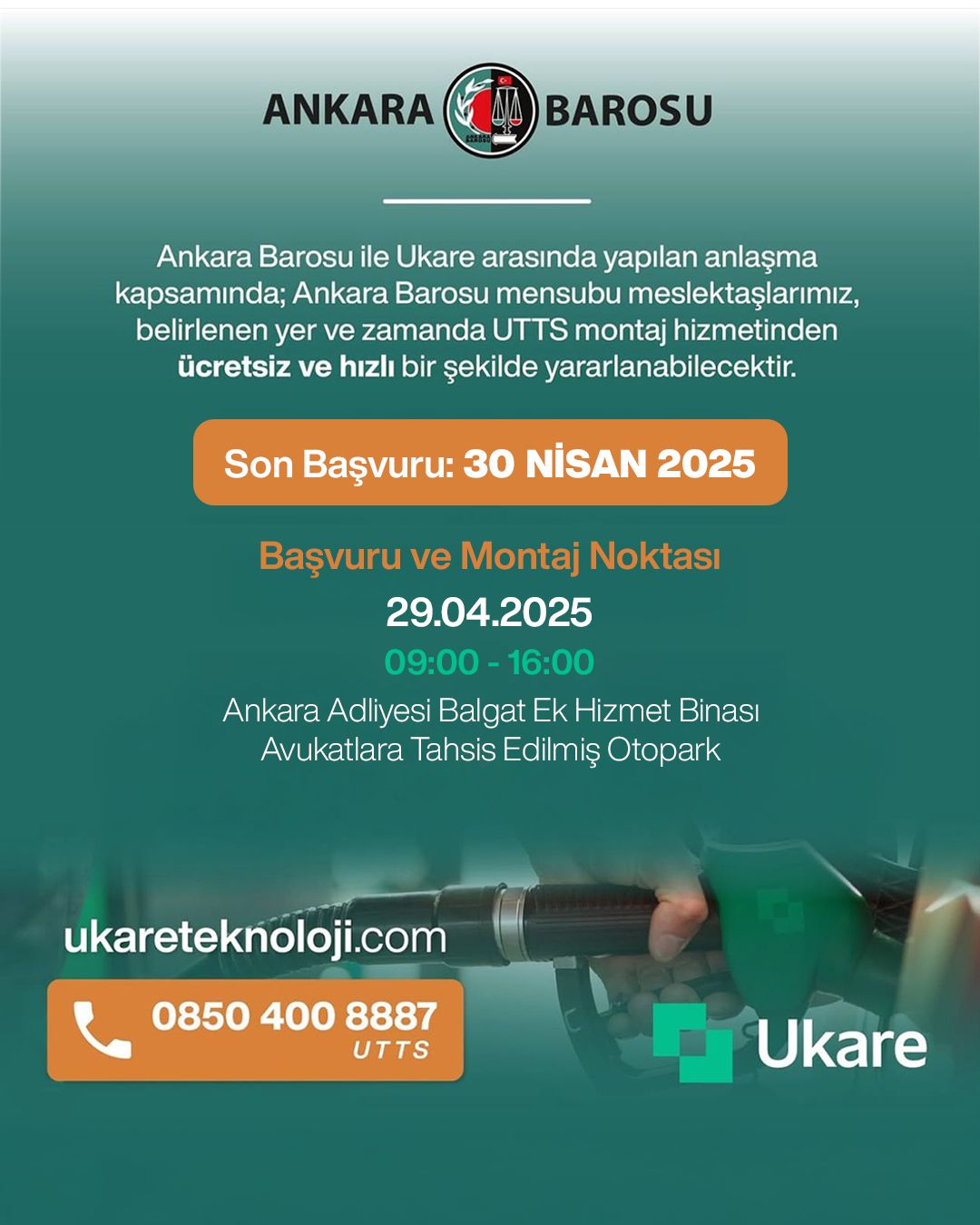 Ankara Barosu ile Ukare arasında yapılan anlaşma kapsamında meslektaşlarımız, 29.04.2025 Salı günü 09.00 – 16.00 saatleri arasında Ankara Adliyesi Balgat Ek Hizmet Binası baro otoparkında UTTS montaj hizmetinden ücretsiz şekilde yararlanabilecek ve başvuru süreciyle ilgili olarak 0850 400 88 87 numaralı telefondan bilgi ve destek alabileceklerdir. Not: Montaj zorunluluğunun yerine getirilmesi içim öngörülen son tarih 30 Nisan 2025’tir. Meslektaşlarımıza saygıyla duyurulur.