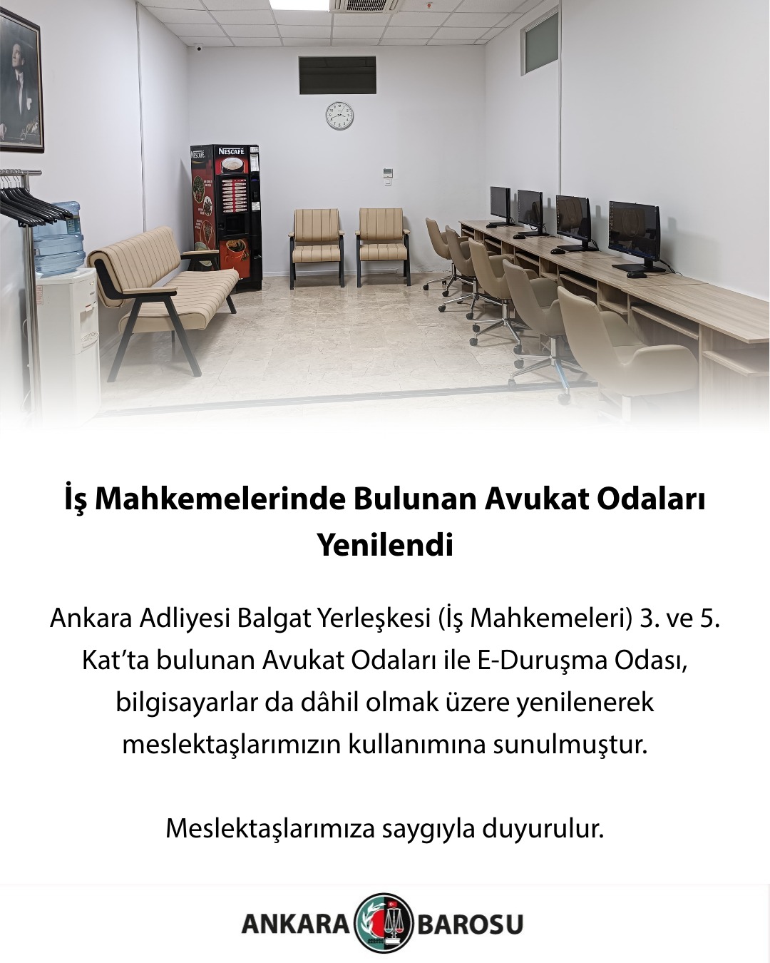 Ankara Adliyesi Balgat Yerleşkesi (İş Mahkemeleri) 3. ve 5. Kat’ta bulunan Avukat Odaları ile E-Duruşma Odası, bilgisayarlar da dâhil olmak üzere yenilenerek meslektaşlarımızın kullanımına sunulmuştur. Meslektaşlarımıza saygıyla duyurulur.