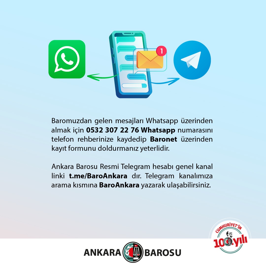 ANKARA BAROSU MESAJLARINI WHATSAPP UYGULAMASINDAN ALMAK İÇİN 0532 307 22 76 WHATSAPP NUMARASINI TELEFON REHBERİNİZE KAYDEDİP BARONET ÜZERİNDEN KAYIT FORMUNU DOLDURMANIZ GEREKMEKTEDİR