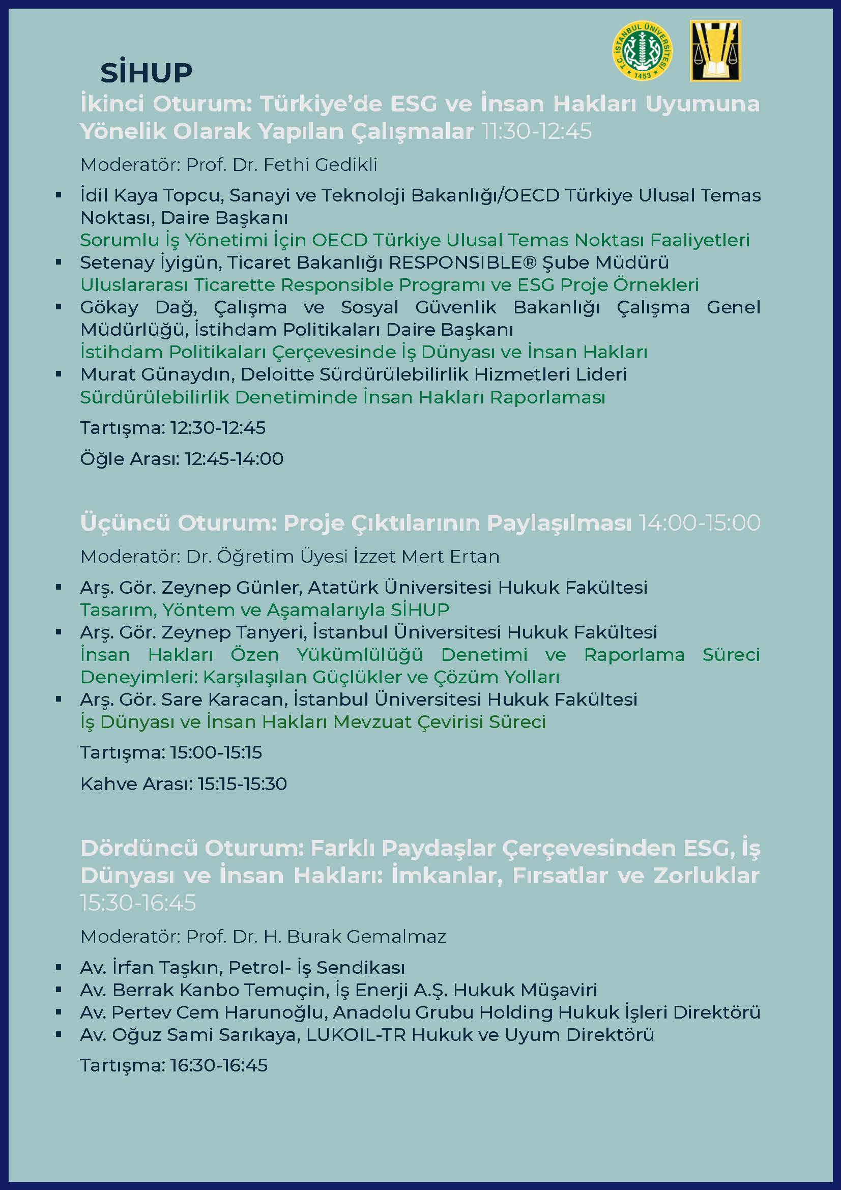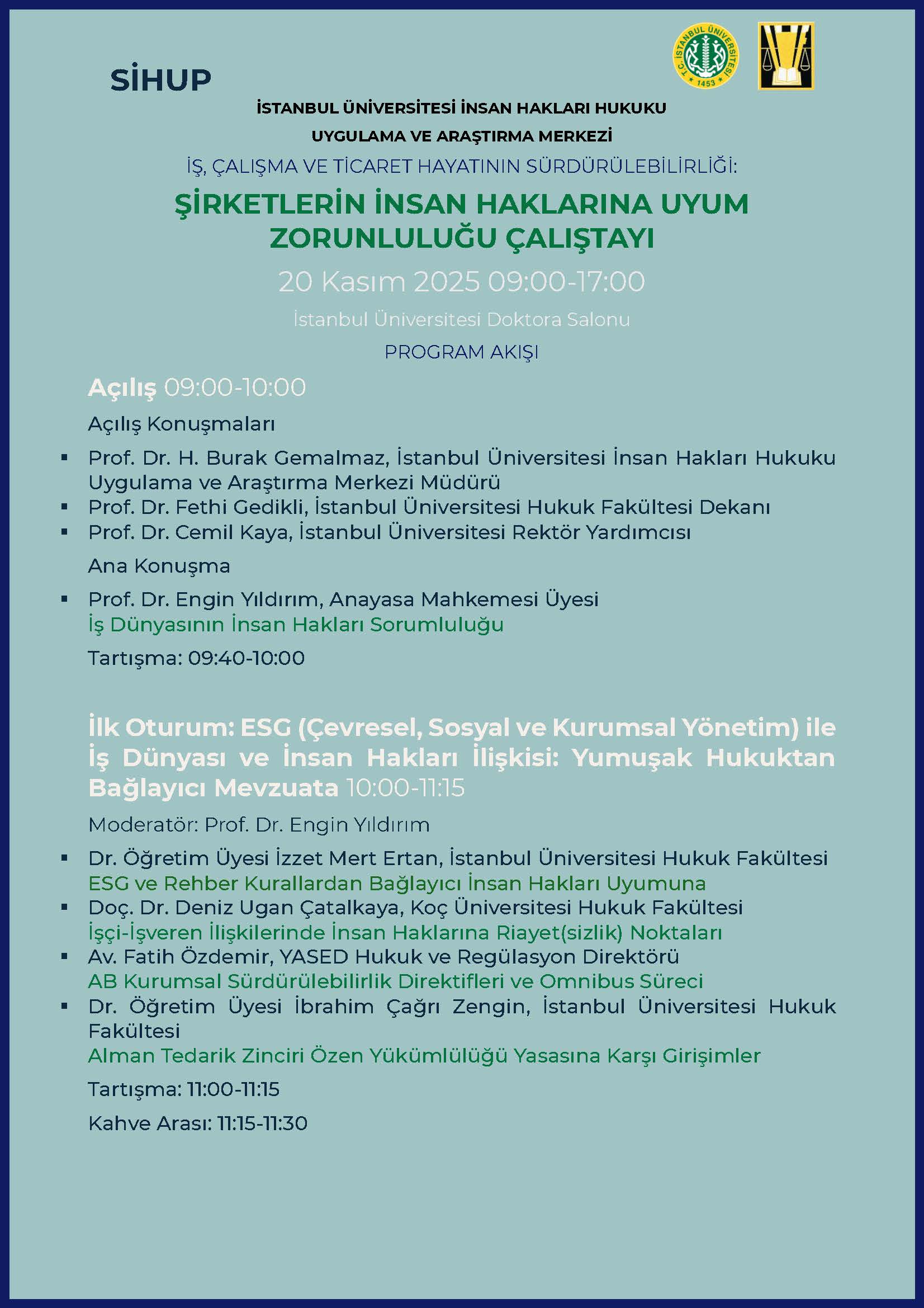 İstanbul Üniversitesi İnsan Hakları Hukuku Uygulama ve Araştırma Merkezi bünyesinde yürütülen Şirketlerin İnsan Haklarına Uyumu (SİHUP) TÜBİTAK Projesi kapsamında 20 Kasım 2025 tarihinde “İş, Çalışma ve Ticaret Hayatının Sürdürülebilirliği: Şirketlerin İnsan Haklarına Uyum Zorunluluğu Çalıştayı” düzenlenecektir.