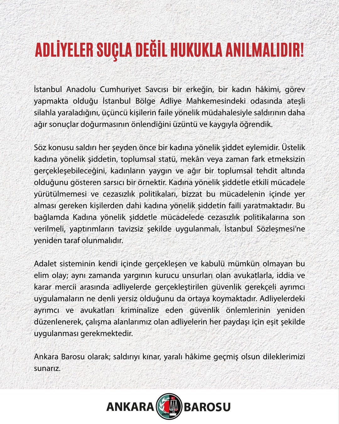 Ankara Barosu olarak; saldırıyı kınar, yaralı hâkime geçmiş olsun dileklerimizi sunarız.