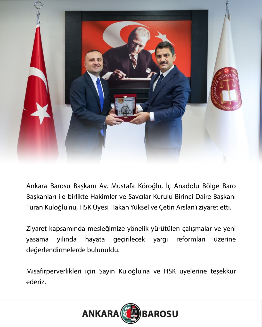 ANKARA BAROSU BAŞKANI AV. MUSTAFA KÖROĞLU, İÇ ANADOLU BÖLGE BARO BAŞKANLARI İLE BİRLİKTE HAKİMLER VE SAVCILAR KURULU BİRİNCİ DAİRE BAŞKANI TURAN KULOĞLU’NU, HSK ÜYESİ HAKAN YÜKSEL VE ÇETİN ARSLAN’I ZİYARET ETTİ