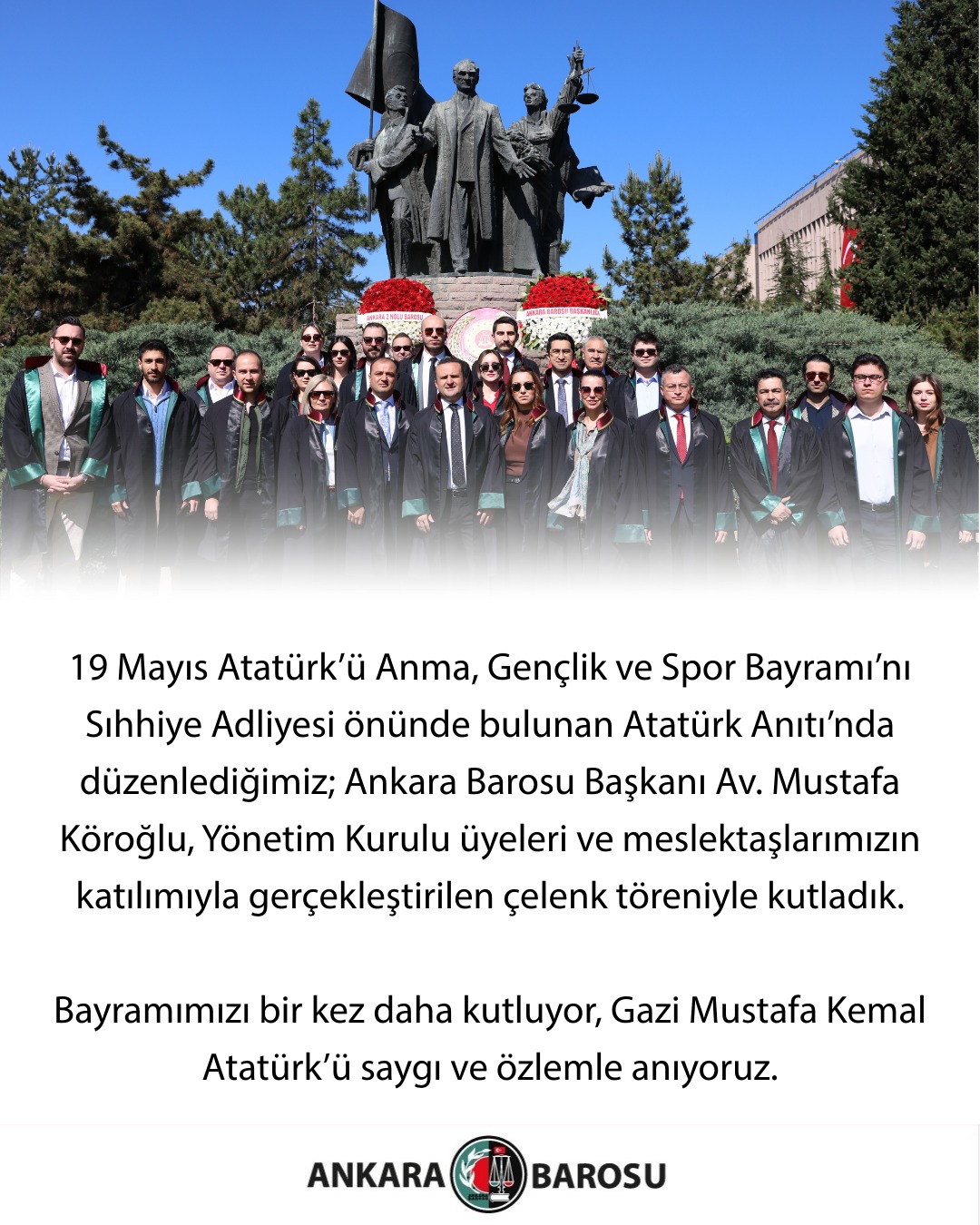 19 MAYIS ATATÜRK’Ü ANMA, GENÇLİK VE SPOR BAYRAMI’NI SIHHİYE ADLİYESİ ÖNÜNDE BULUNAN ATATÜRK ANITI’NDA DÜZENLEDİĞİMİZ; ANKARA BAROSU BAŞKANI AV. MUSTAFA KÖROĞLU, YÖNETİM KURULU ÜYELERİ VE MESLEKTAŞLARIMIZIN KATILIMIYLA GERÇEKLEŞTİRİLEN ÇELENK TÖRENİYLE KUTLADIK. BAYRAMIMIZI BİR KEZ DAHA KUTLUYOR, GAZİ MUSTAFA KEMAL ATATÜRK’Ü SAYGI VE ÖZLEMLE ANIYORUZ