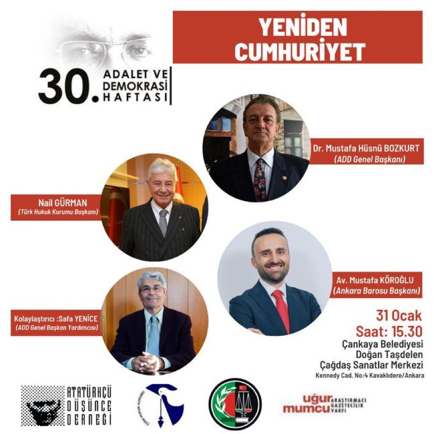 GAZETECİ-YAZAR UĞUR MUMCU İLE PROF. DR. MUAMMER AKSOY’UN ÖLÜM YIL DÖNÜMLERİNE İLİŞKİN "30. ADALET VE DEMOKRASİ HAFTASI" ETKİNLİKLERİ KAPSAMINDA DÜZENLENECEK “YENİDEN CUMHURİYET” KONULU PANELDE SİZLERİ ARAMIZDA GÖRMEK BİZİ ONURLANDIRACAKTIR. 15.30 DOĞAN TAŞDELEN ÇAĞDAŞ SANATLAR MERKEZİ