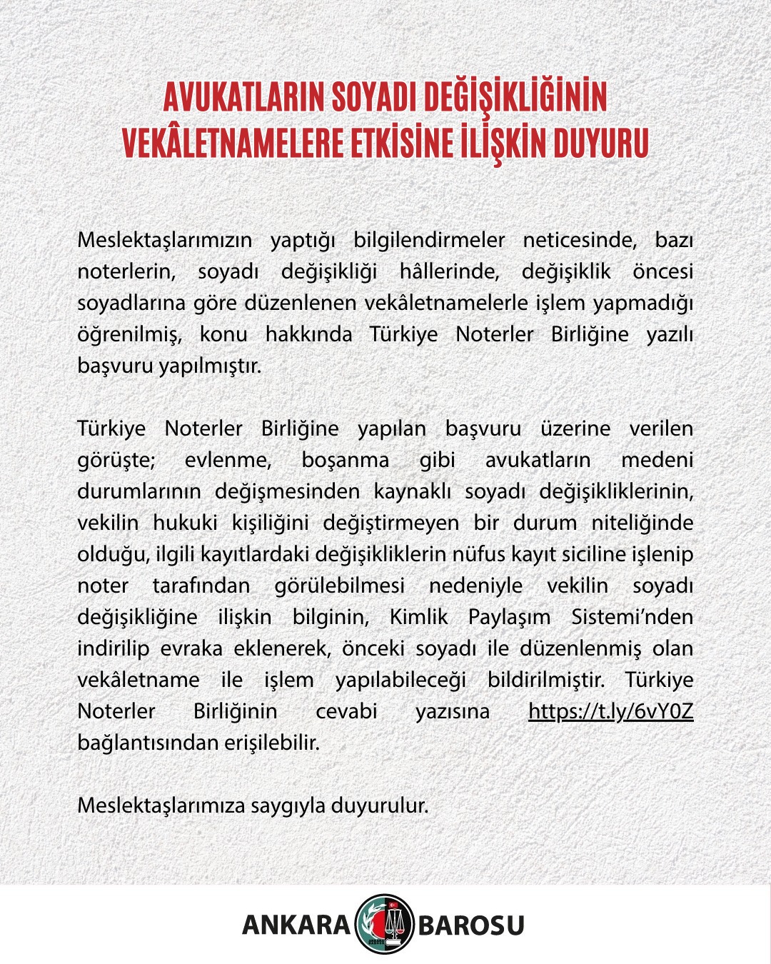 AVUKATLARIN SOYADI DEĞİŞİKLİĞİNİN VEKÂLETNAMELERE ETKİSİNE İLİŞKİN DUYURU
