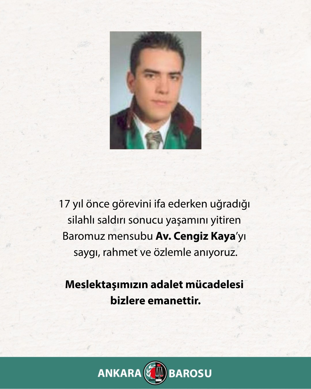 17 YIL ÖNCE GÖREVİNİ İFA EDERKEN UĞRADIĞI SİLAHLI SALDIRI SONUCU YAŞAMINI YİTİREN BAROMUZ MENSUBU AV. CENGİZ KAYA’YI SAYGI, RAHMET VE ÖZLEMLE ANIYORUZ. MESLEKTAŞIMIZIN ADALET MÜCADELESİ BİZLERE EMANETTİR.