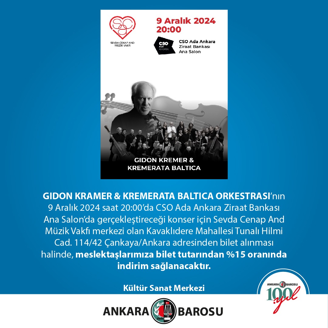 GIDON KRAMER & KREMERATA BALTICA ORKESTRASI'NIN 9 ARALIK 2024 SAAT 20:00'DA CSO ADA ANKARA ZİRAAT BANKASI ANA SALON'DA GERÇEKLEŞTİRECEĞİ KONSER İÇİN SEVDA CENAP AND MÜZİK VAKFI MERKEZİ OLAN KAVAKLIDERE MAHALLESİ TUNALI HİLMİ CAD. 114/42 ÇANKAYA/ANKARA ADRESİNDEN BİLET ALINMASI HALİNDE, MESLEKTAŞLARIMIZA BİLET TUTARINDAN %15 ORANINDA İNDİRİM SAĞLANACAKTIR