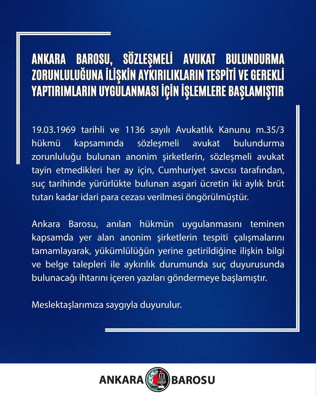 ANKARA BAROSU, SÖZLEŞMELİ AVUKAT BULUNDURMA ZORUNLULUĞUNA İLİŞKİN AYKIRILIKLARIN TESPİTİ VE GEREKLİ YAPTIRIMLARIN UYGULANMASI İÇİN İŞLEMLERE BAŞLAMIŞTIR