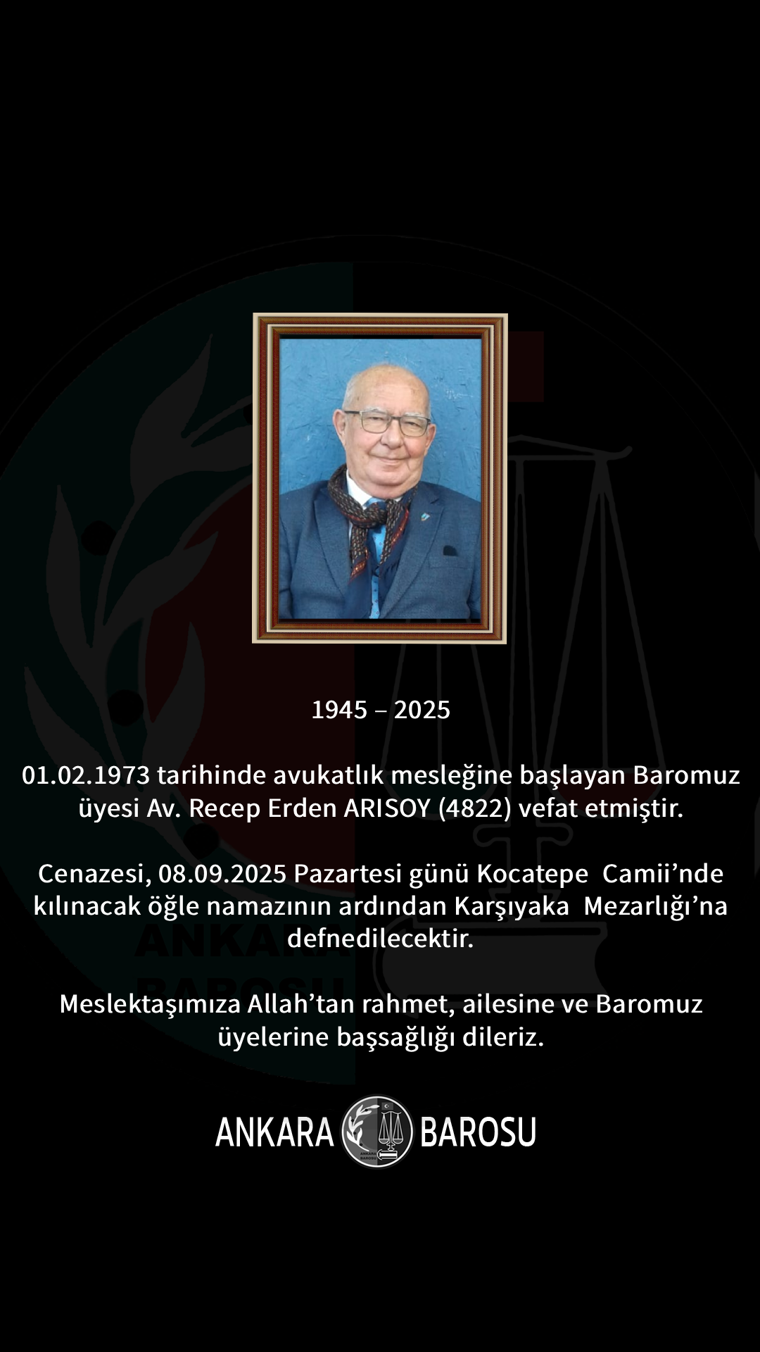 BAROMUZ ÜYESİ AV. RECEP ERDEN ARISOY (4822) VEFAT ETMİŞTİR